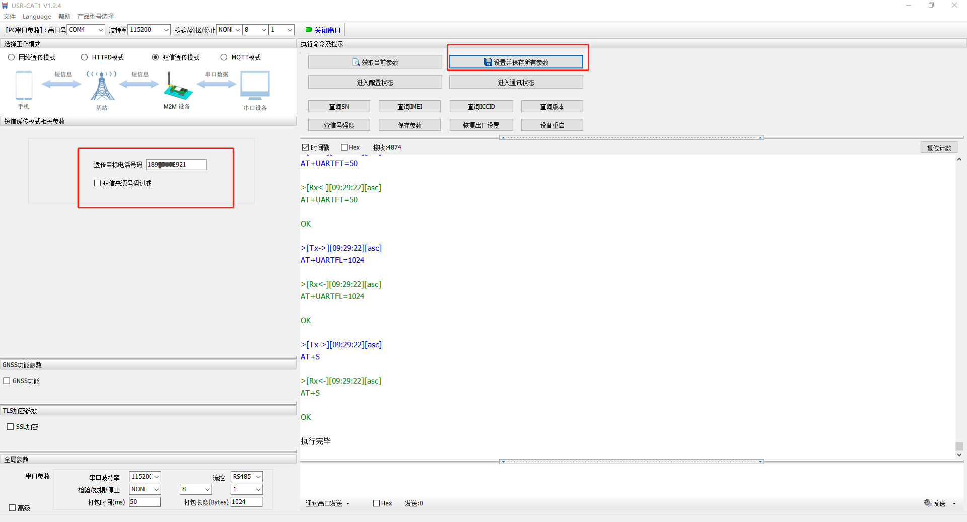 4、選擇短信透傳模式,透傳目標(biāo)電話號碼輸入另一個(gè)可以正常接收短信的手機(jī)號碼,點(diǎn)擊設(shè)置并保存所有參數(shù),然后再關(guān)閉串口。
