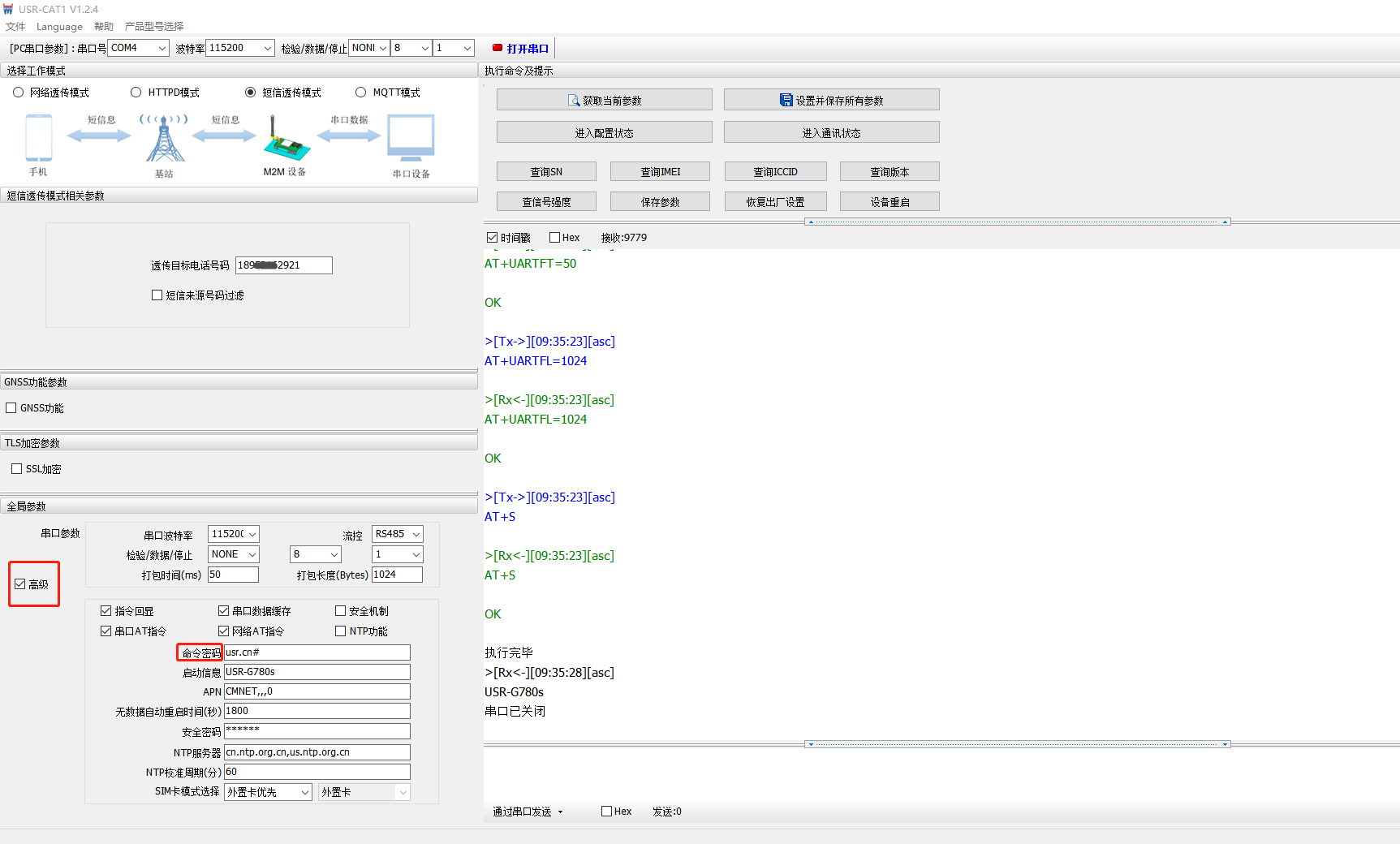 命令密碼默認(rèn)是usr.cn#,USR-G780s用設(shè)置軟件讀取參數(shù),勾選高級,可以從高級內(nèi)容中,查詢或修改命令密碼。