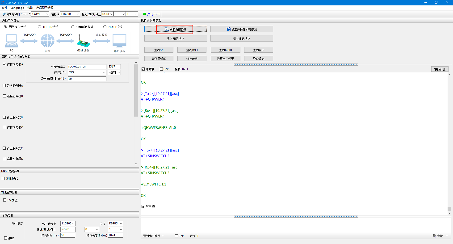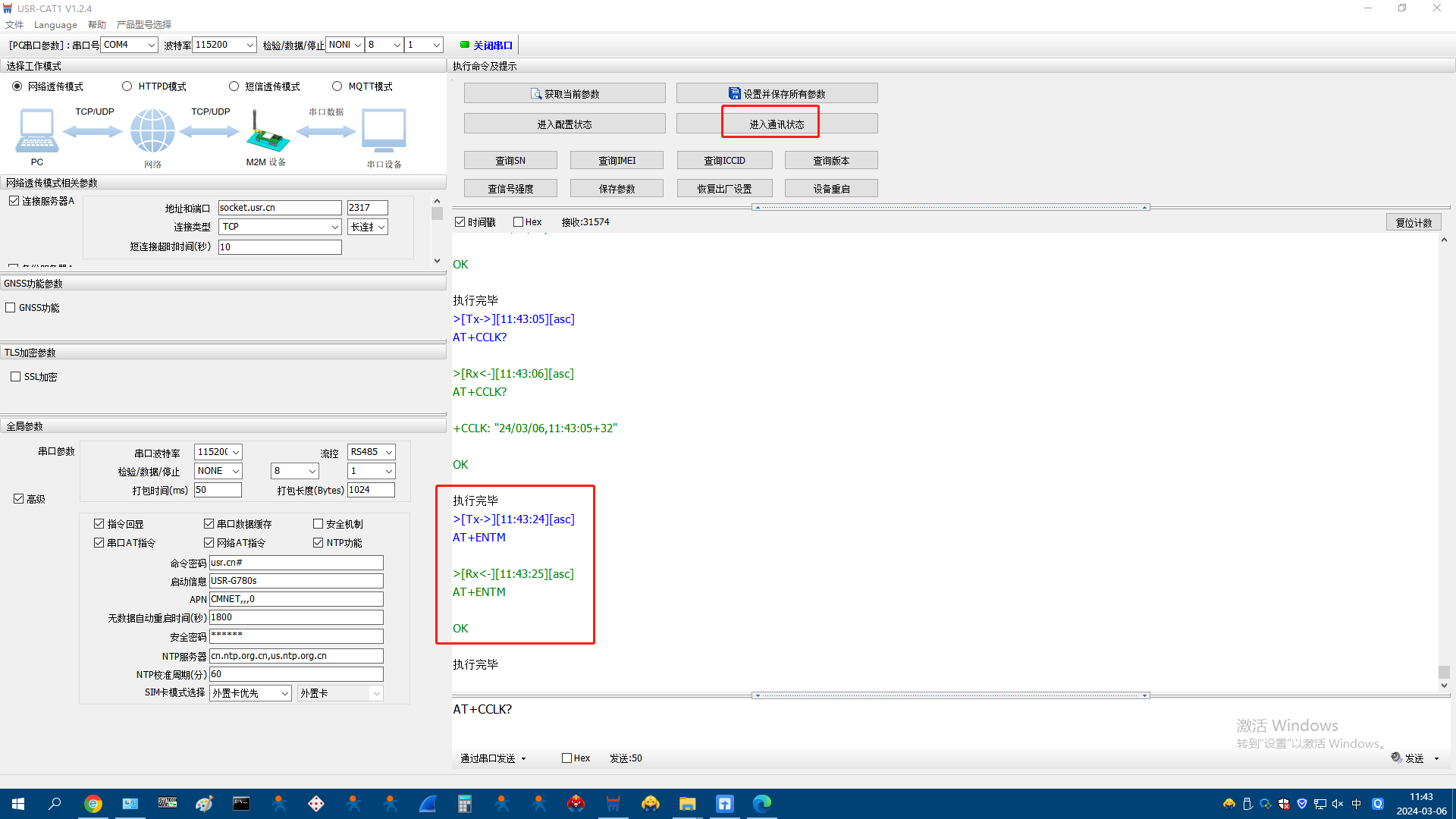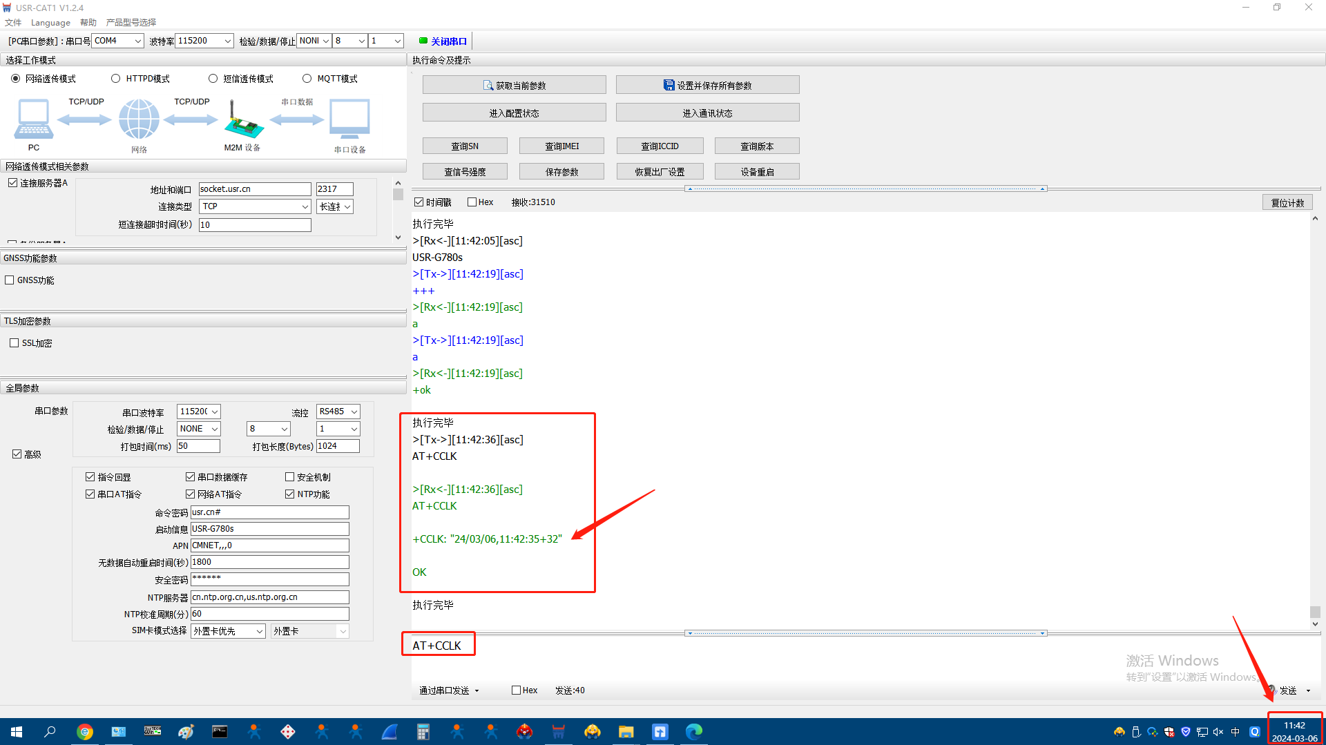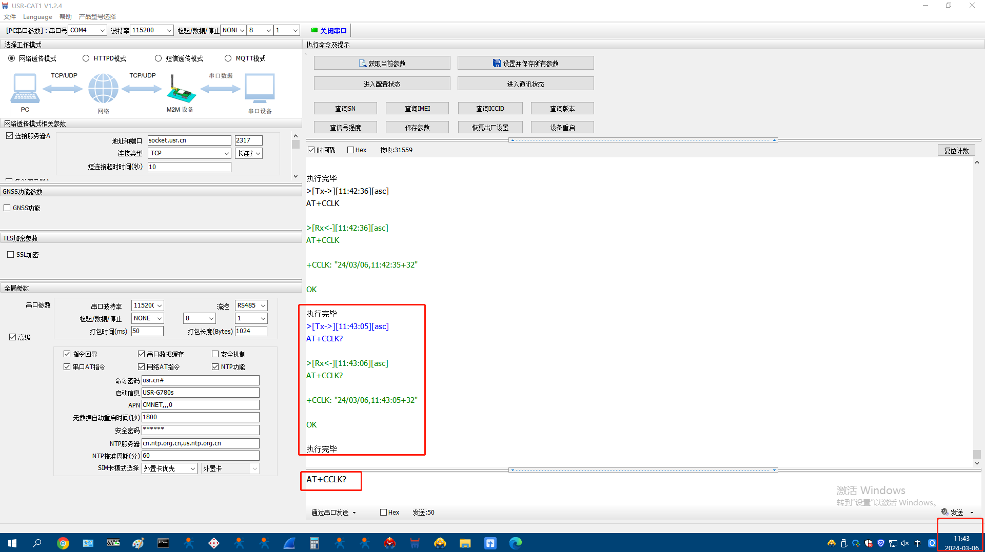 輸入框輸入AT+CCLK? 英文格式的問號,點擊發(fā)送,可以獲取當前時間。