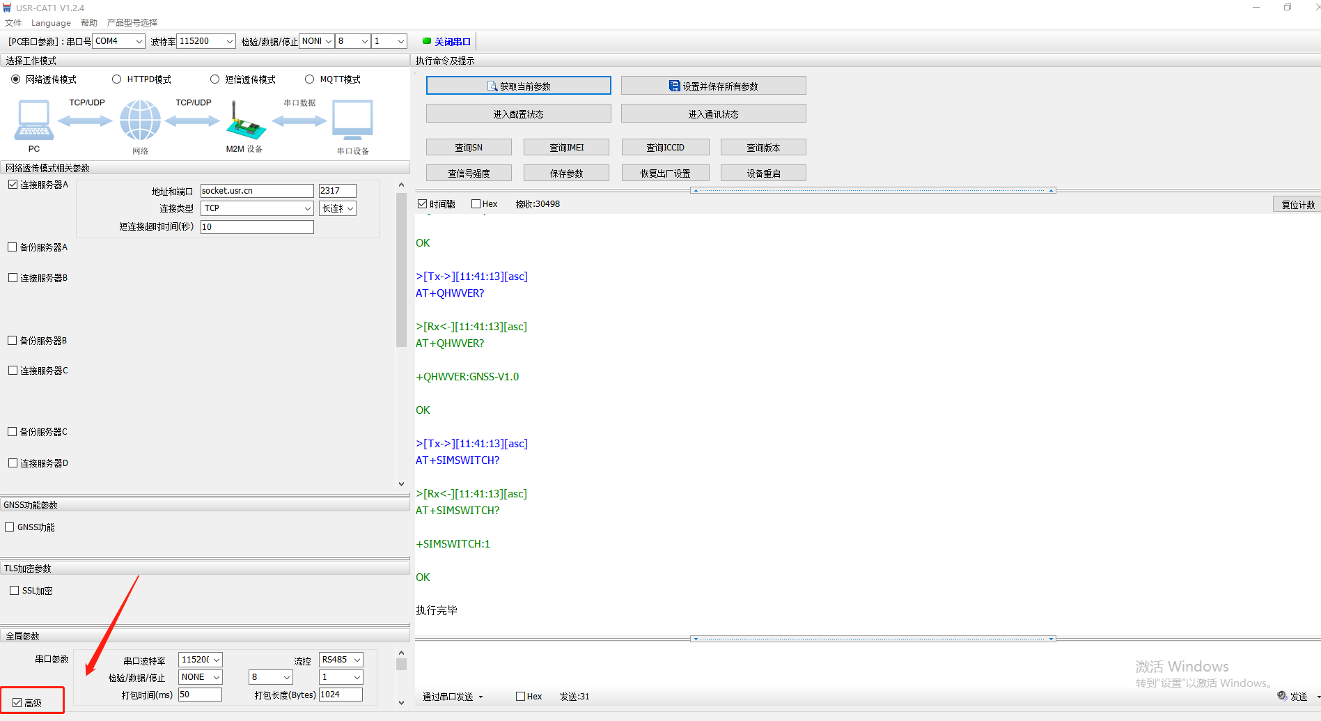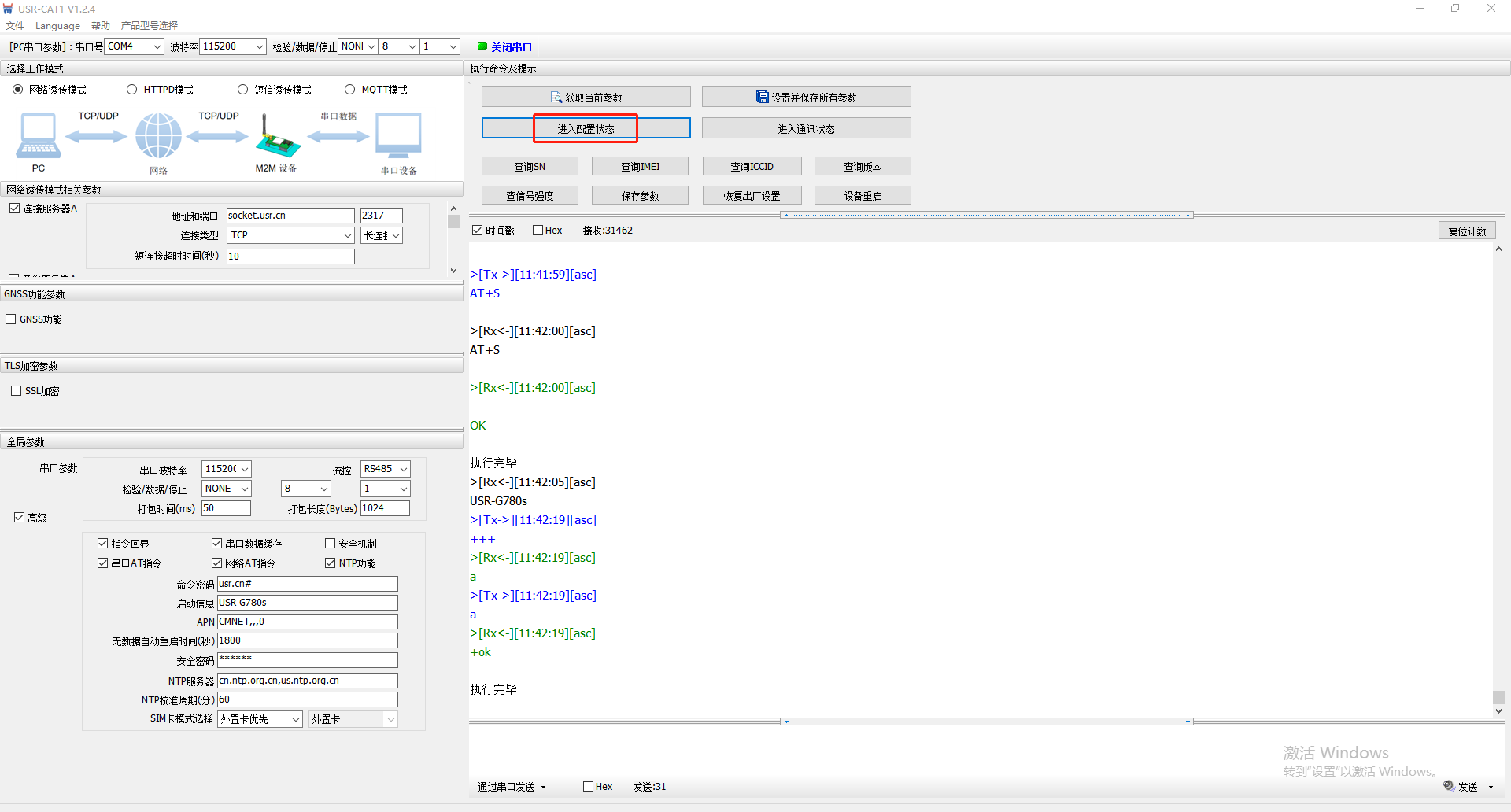USR-G780s 的232串口接USB-RS232串口線到電腦USB口,接好4G天線,然后產品接12V電源適配器上電。