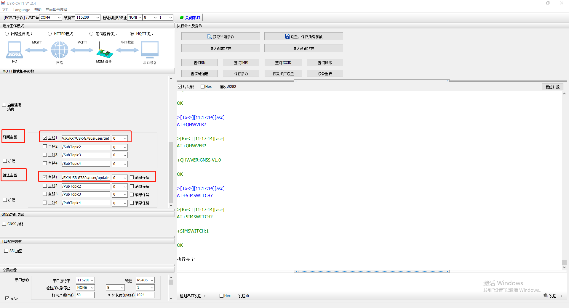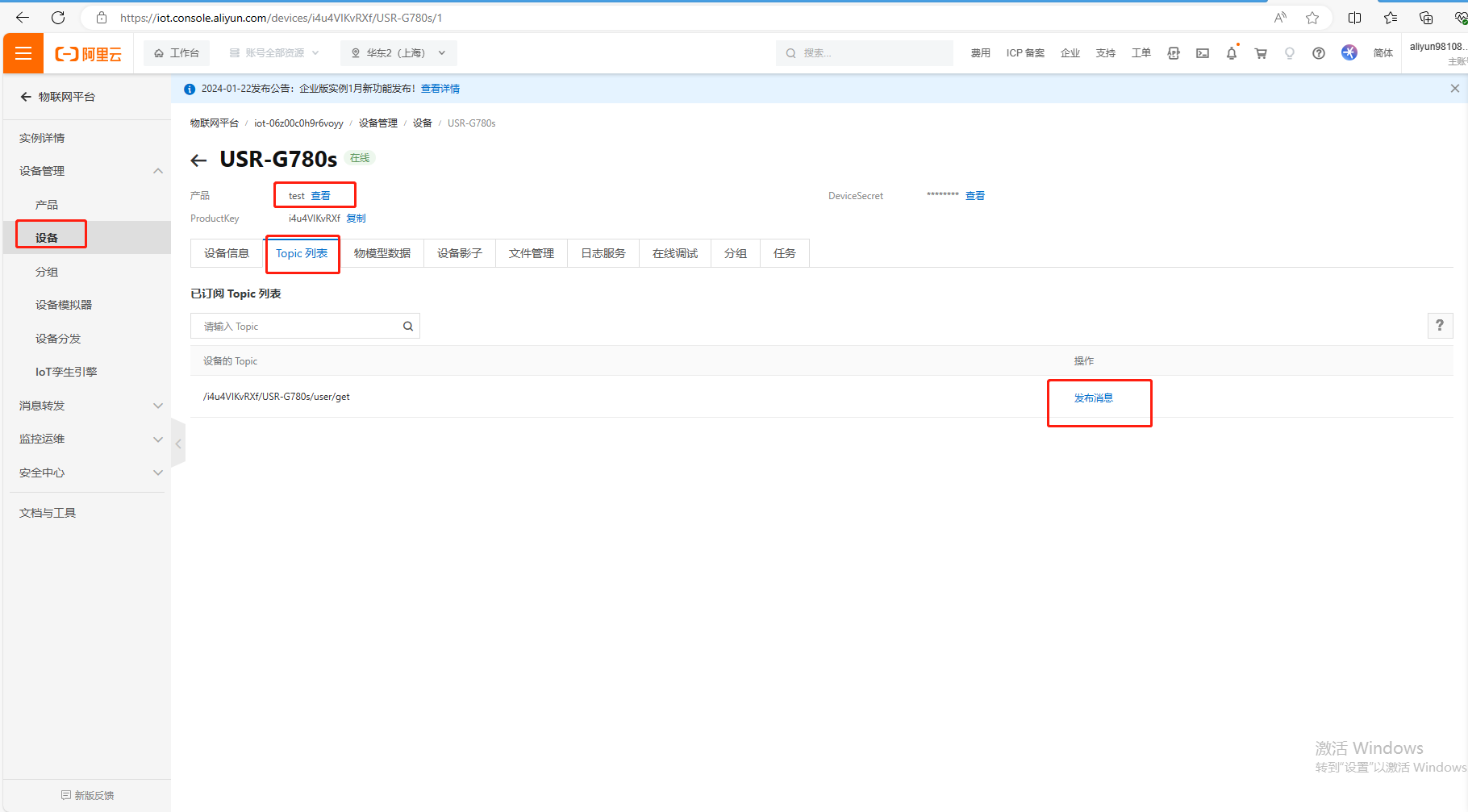 將訂閱的主題/i4u4VIKvRXf/USR-G780s/user/get填寫到USR-G780s訂閱主題配置中去;