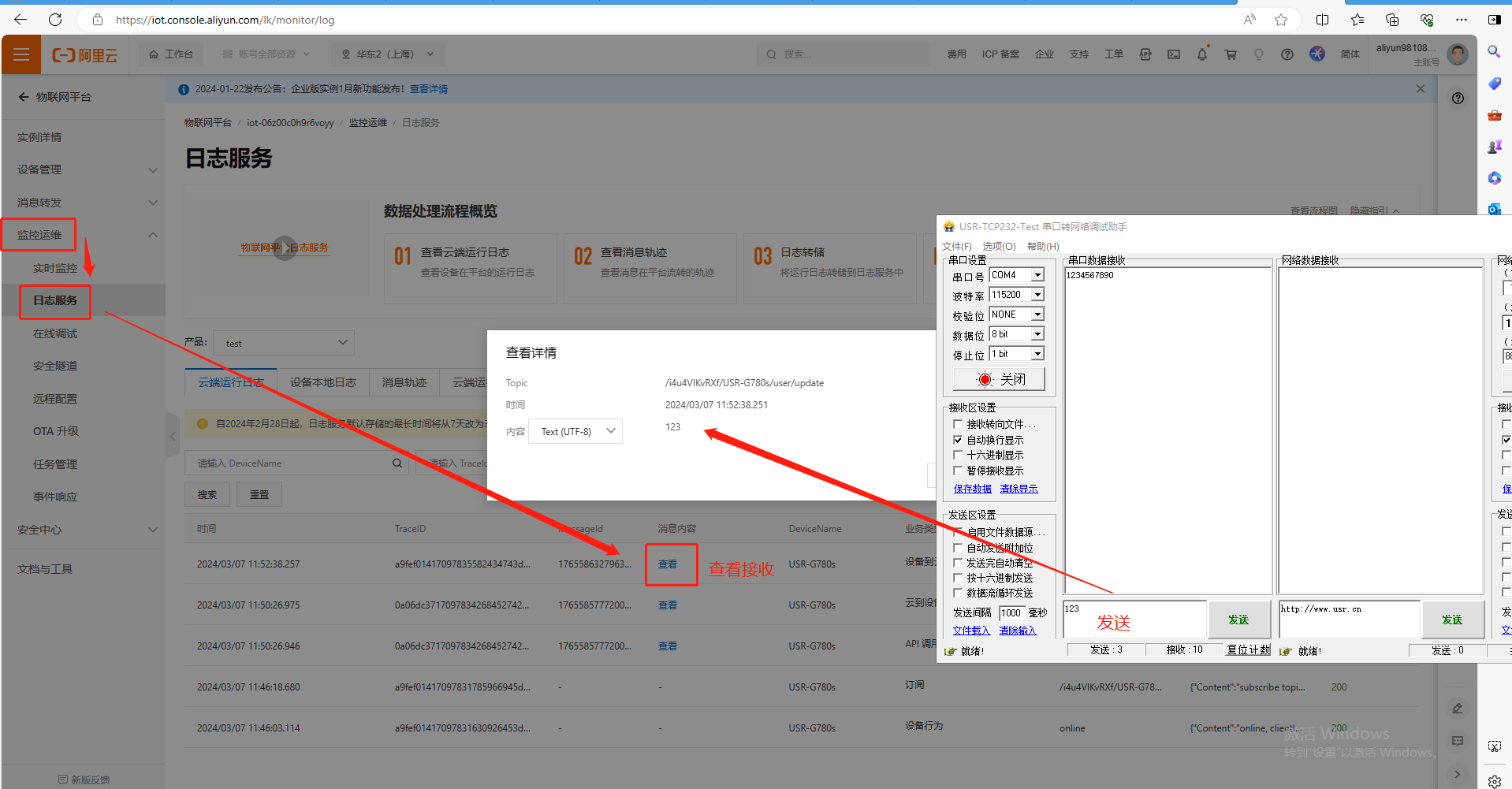 (2)USR-G780s使用串口助手發(fā)送數(shù)據(jù)123,發(fā)送完成之后,我們在阿里云平臺可以通過日志服務(wù),點擊查看,看到USR-G780s串口發(fā)到阿里云的數(shù)據(jù)123。