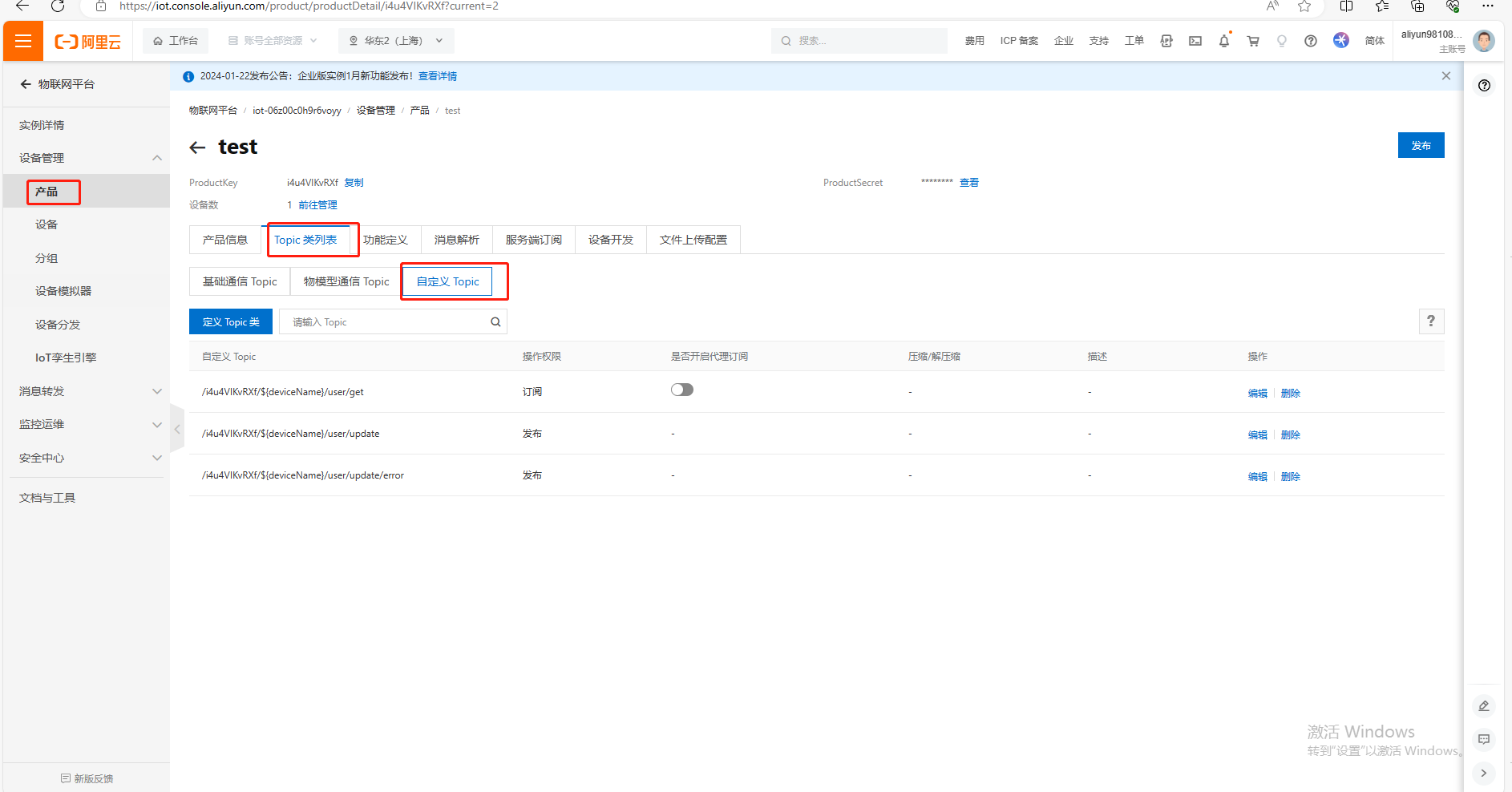 (2)點擊Topic類列表,點擊自定義Topic,找到訂閱和發(fā)布