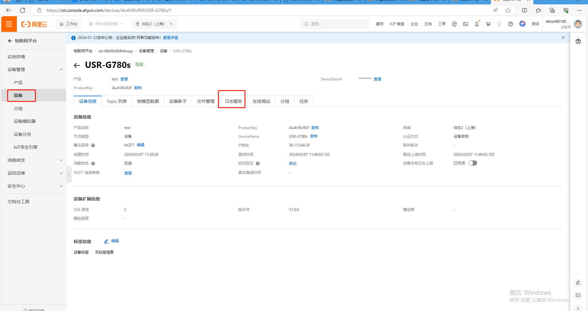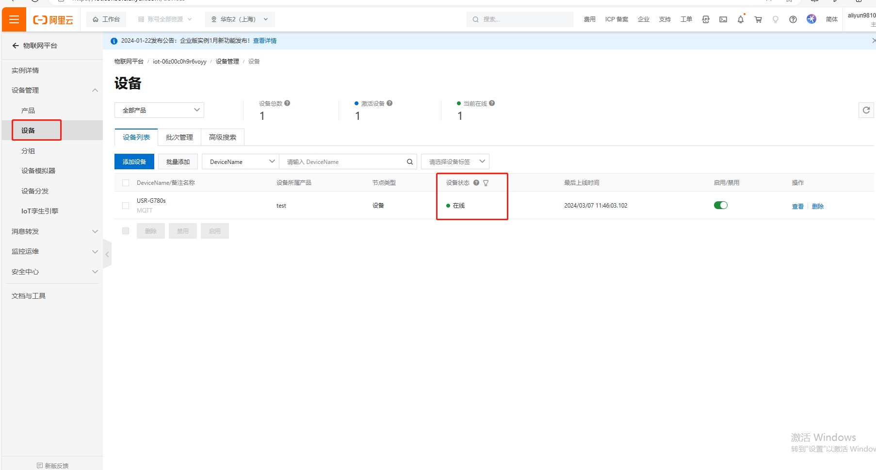 USR-G780s 設(shè)置完MQTT連接阿里云參數(shù),聯(lián)網(wǎng)正常,在阿里云平臺可以看到設(shè)備狀態(tài)是在線。