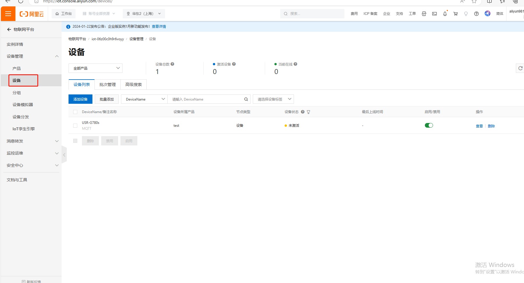 (2)添加完設(shè)備,如下圖展示,設(shè)備狀態(tài)是未激活,等設(shè)置完USR-G780s的MQTT連接阿里云參數(shù)之后,設(shè)備狀態(tài)才顯示在線。