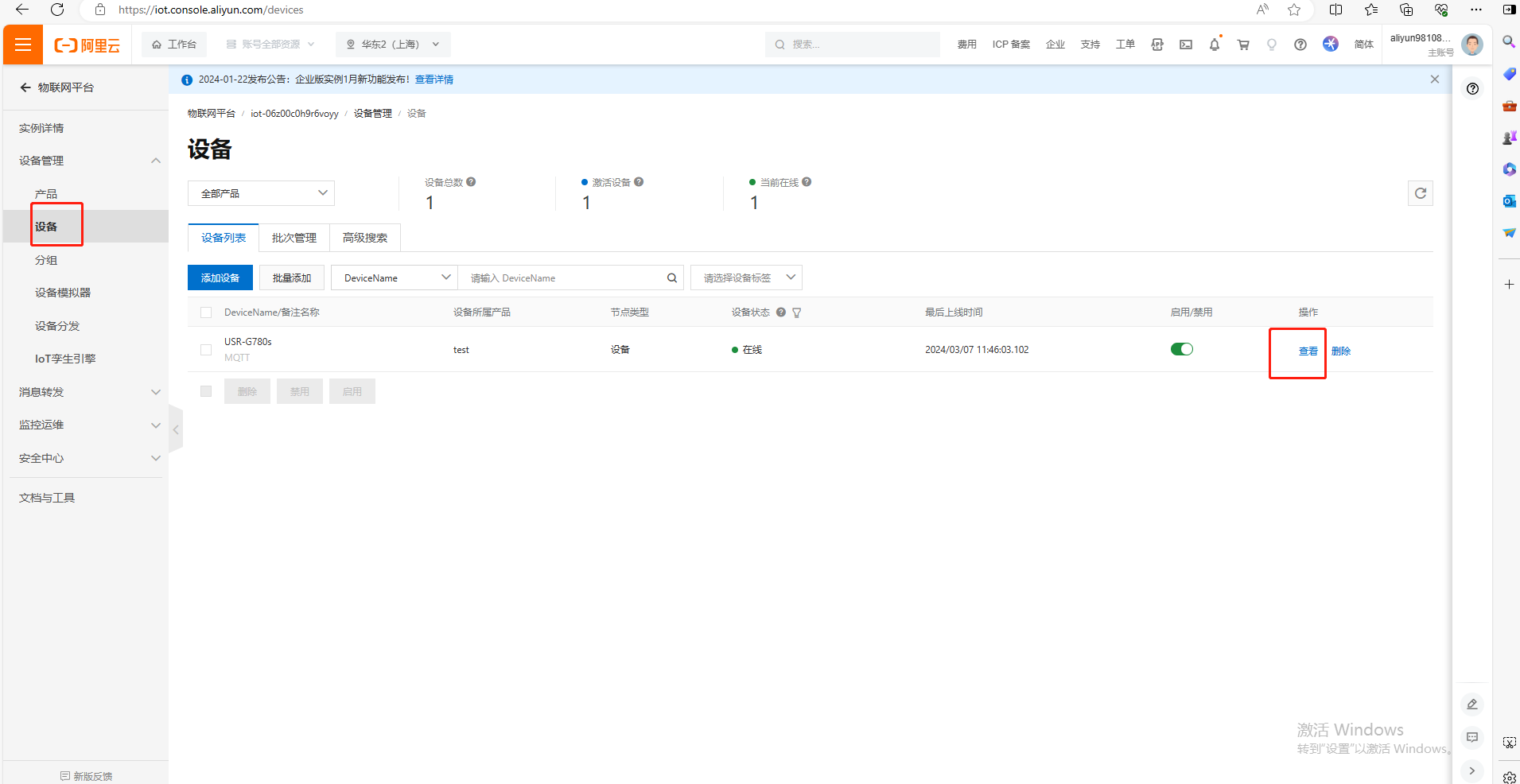 1、查看阿里云設(shè)備狀態(tài)在線