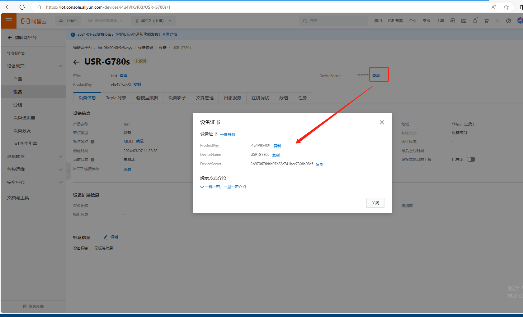 點擊設(shè)備,點擊查看,再點擊DeviceSecret后面的查看。