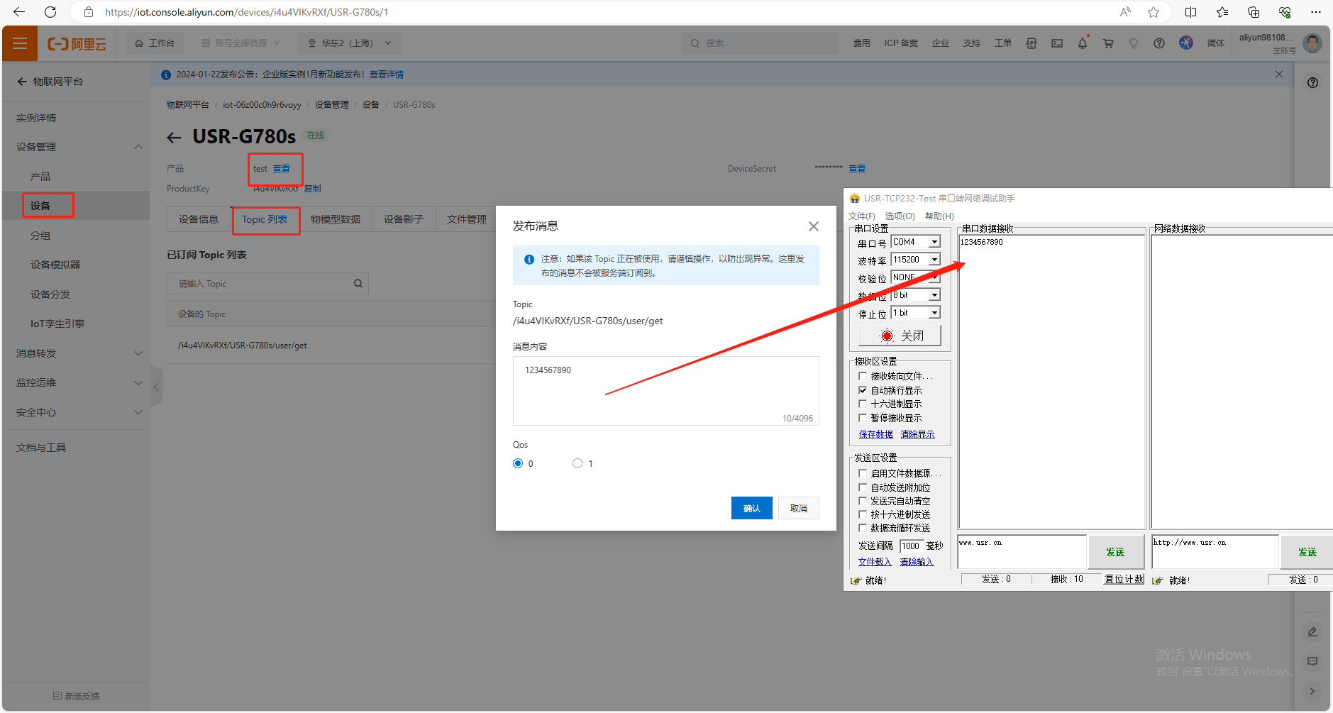 (3)使用阿里云平臺發(fā)布的消息1234567890,被USR-G780s訂閱到,并通過USR-G780s串口發(fā)給串口端,串口助手接收到阿里云下發(fā)的數(shù)據(jù)1234567890。