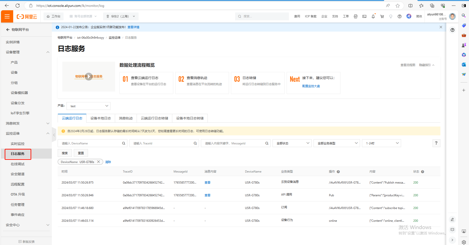 (1)點擊設(shè)備,點擊日志服務(wù)