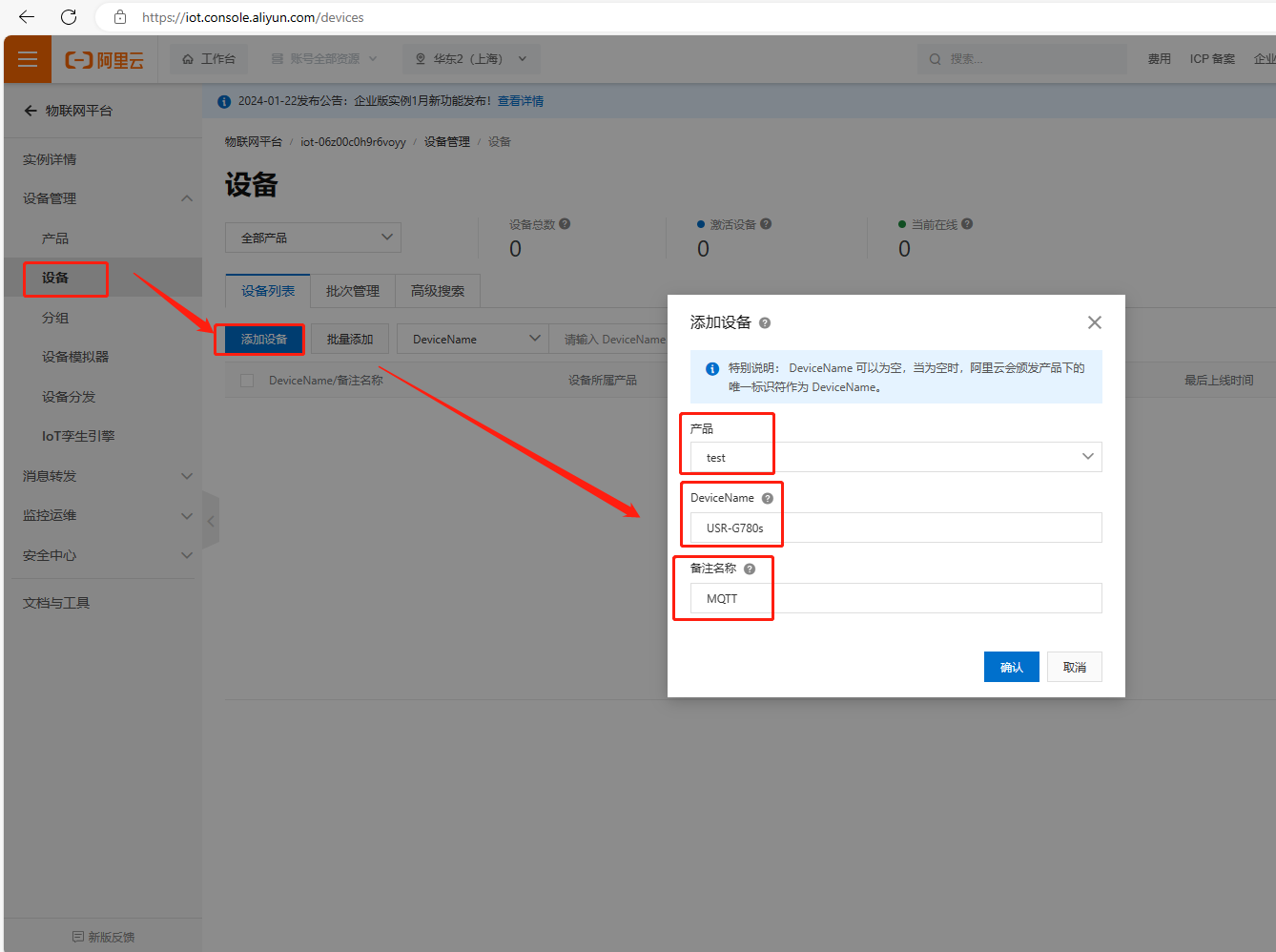 (1)產(chǎn)品創(chuàng)建成功后,添加設(shè)備。點擊設(shè)備,點擊添加設(shè)備,產(chǎn)品名舉例填test,DeviceName填USR-G780s,備注名稱填MQTT,點擊確認。