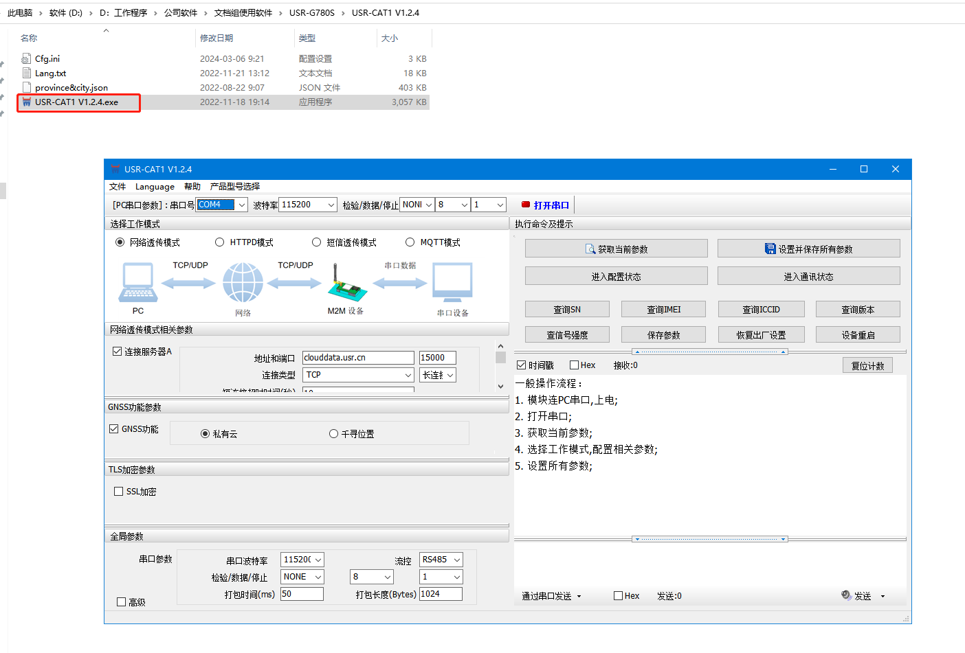 USR-G780s 的232串口接USB-RS232串口線到電腦USB口,接好4G天線,然后產(chǎn)品接12V電源適配器上電。