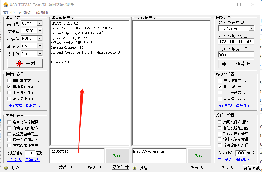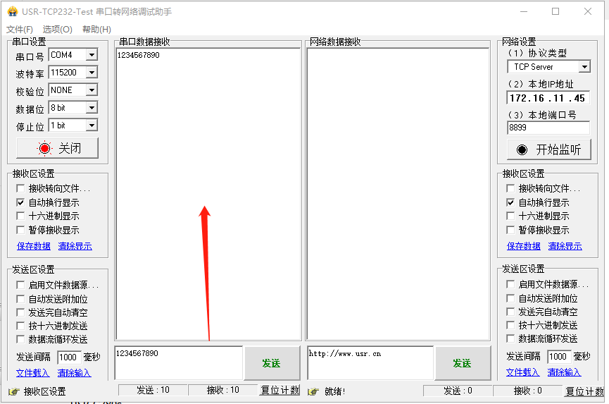 打開(kāi)串口助手,串口參數(shù)和USR-G780s串口參數(shù)設(shè)置一致,發(fā)送1234567890給有人公司的測(cè)試服務(wù)器,測(cè)試服務(wù)器收到串口發(fā)送的數(shù)據(jù),會(huì)將數(shù)據(jù)返回給串口。因?yàn)殚_(kāi)啟過(guò)濾HTTP頭功能,所以返回的信息中,只有數(shù)據(jù)1234567890。