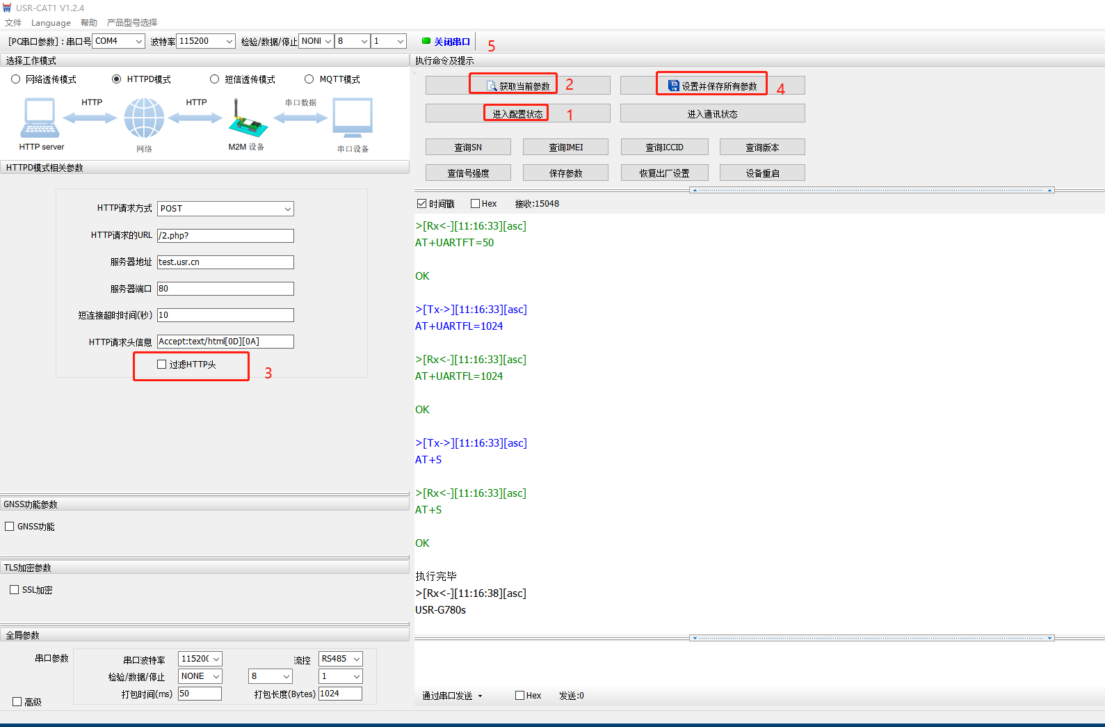 (1)關(guān)閉串口助手,打開(kāi)USR-G780s的設(shè)置軟件,打開(kāi)串口,點(diǎn)擊進(jìn)入配置狀態(tài),點(diǎn)擊獲取當(dāng)前參數(shù),取消勾選過(guò)濾HTTP頭功能,點(diǎn)擊設(shè)置并保存所有參數(shù)。參數(shù)設(shè)置成功之后,設(shè)置軟件關(guān)閉串口。