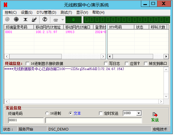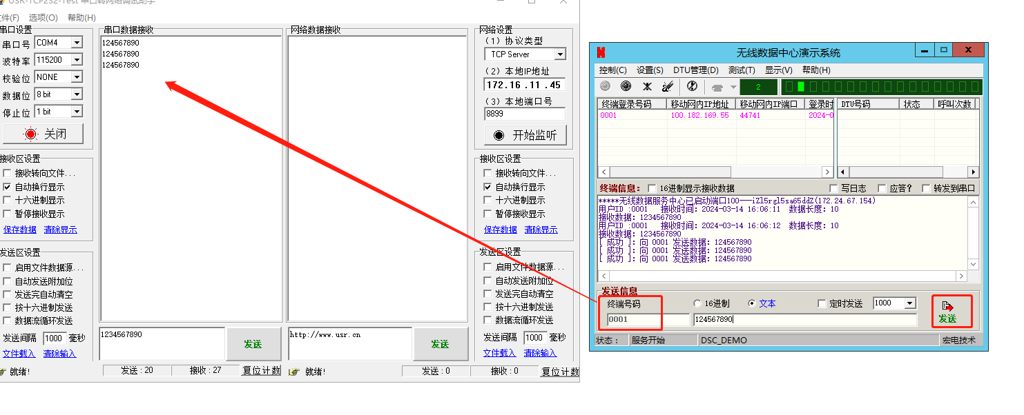 6、無線數(shù)據(jù)中心演示系統(tǒng)發(fā)送信息區(qū),對(duì)終端號(hào)碼0001,發(fā)送1234567890,USR-G780 V2連接的串口助手,接收到數(shù)據(jù)1234567890。
