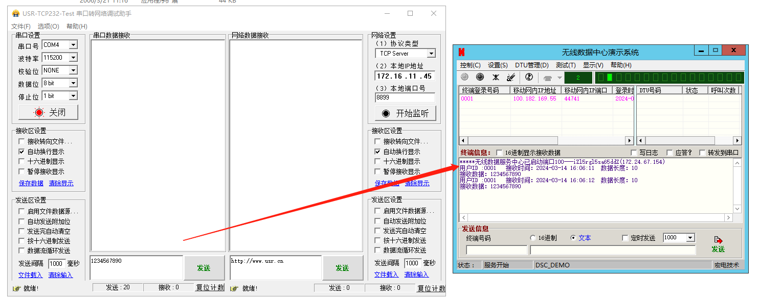 5、 USR-G780 V2接USB-RS232到電腦,電腦打開串口助手,打開COM口,發(fā)送數(shù)據(jù)1234567890,遠(yuǎn)程服務(wù)器上的無線數(shù)據(jù)中心演示系統(tǒng)顯示接收信息。