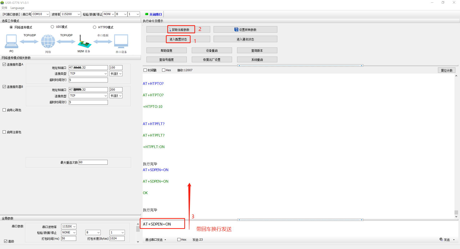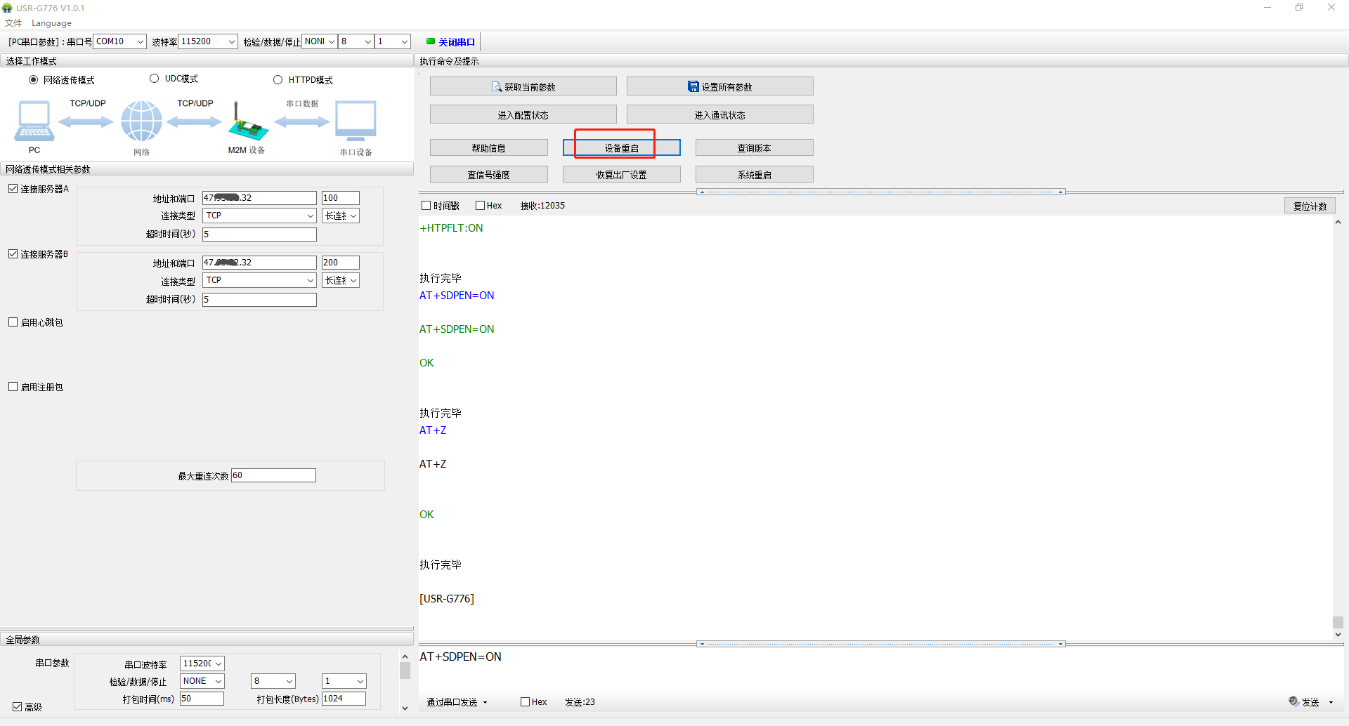 5、串口再次進(jìn)入配置狀態(tài),用AT指令A(yù)T+SDPEN=ON開啟套接字分發(fā)功能,點(diǎn)擊設(shè)備重啟。