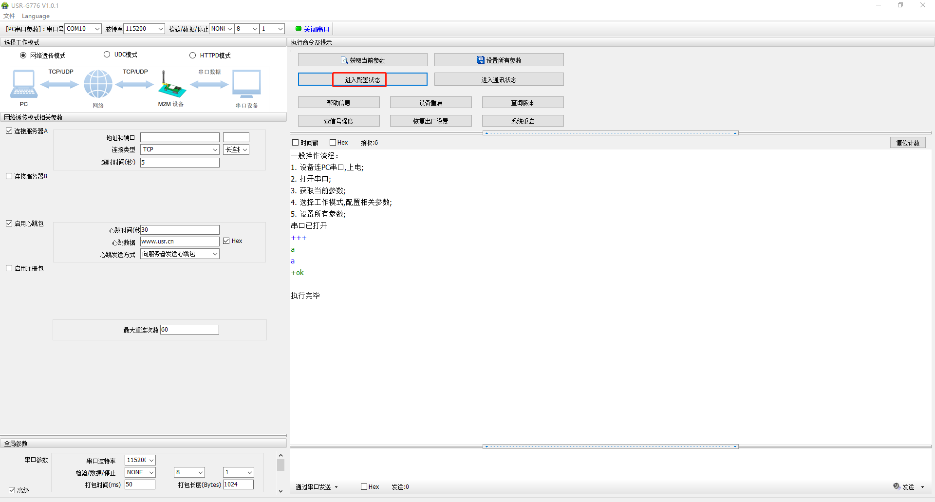 2、打開串口,點(diǎn)擊進(jìn)入配置狀態(tài)