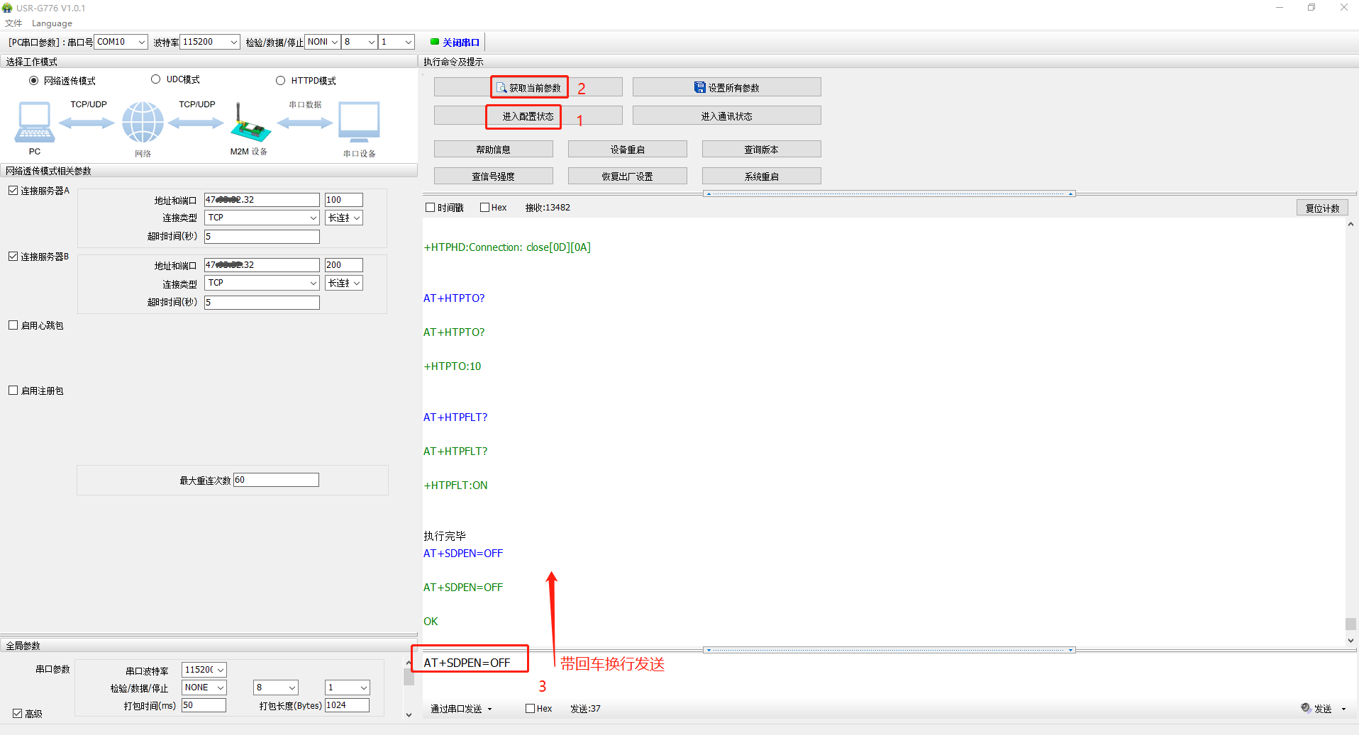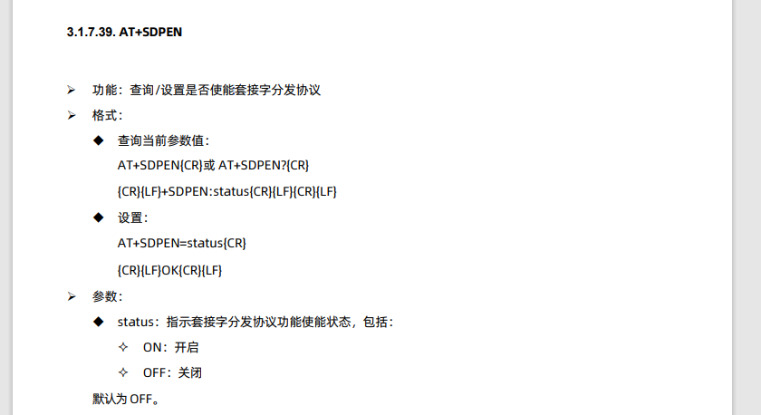 1、設(shè)置軟件串口進(jìn)入配置狀態(tài),獲取當(dāng)前參數(shù),用AT指令A(yù)T+SDPEN=OFF關(guān)閉套接字分發(fā)功能。