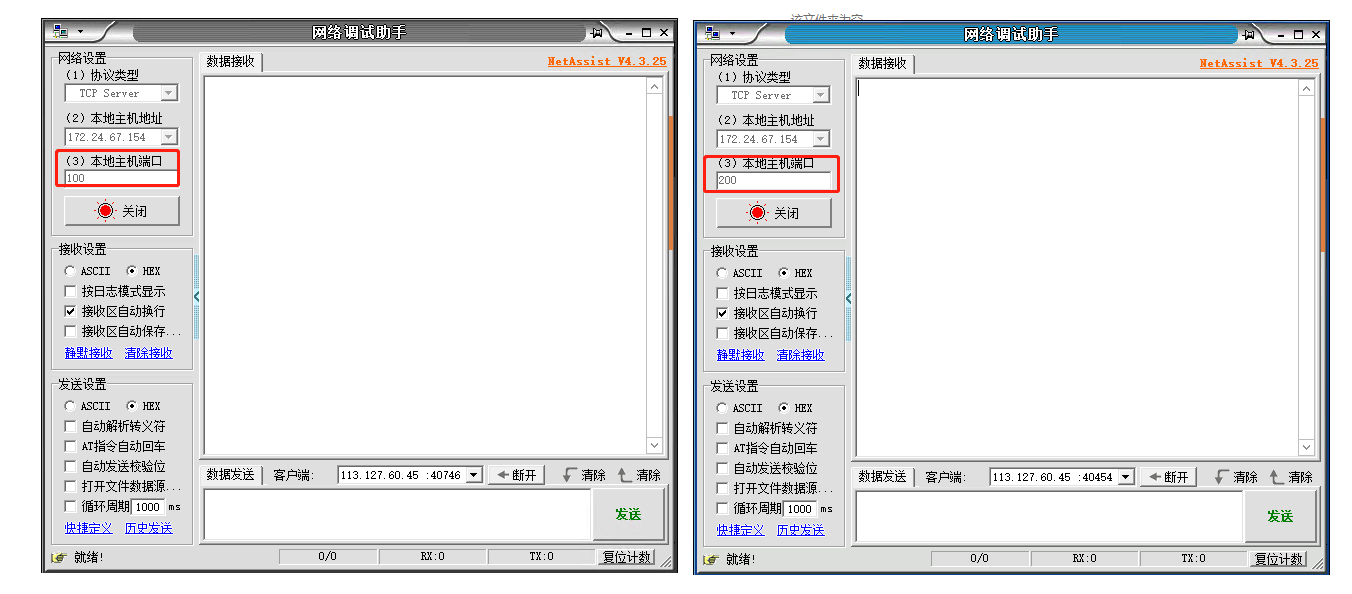 1、登錄遠(yuǎn)程服務(wù)器,打開2個(gè)網(wǎng)絡(luò)助手,分別使用2個(gè)端口100、200,點(diǎn)擊連接。USR-G776會(huì)和2個(gè)網(wǎng)絡(luò)助手建立TCP連接。