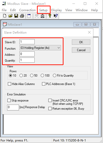 (1)點擊Setup,Slave ID從機地址用1,F(xiàn)unction功能碼用03,Address寄存器起始地址用0,Quantity寄存器地址數(shù)量用1。