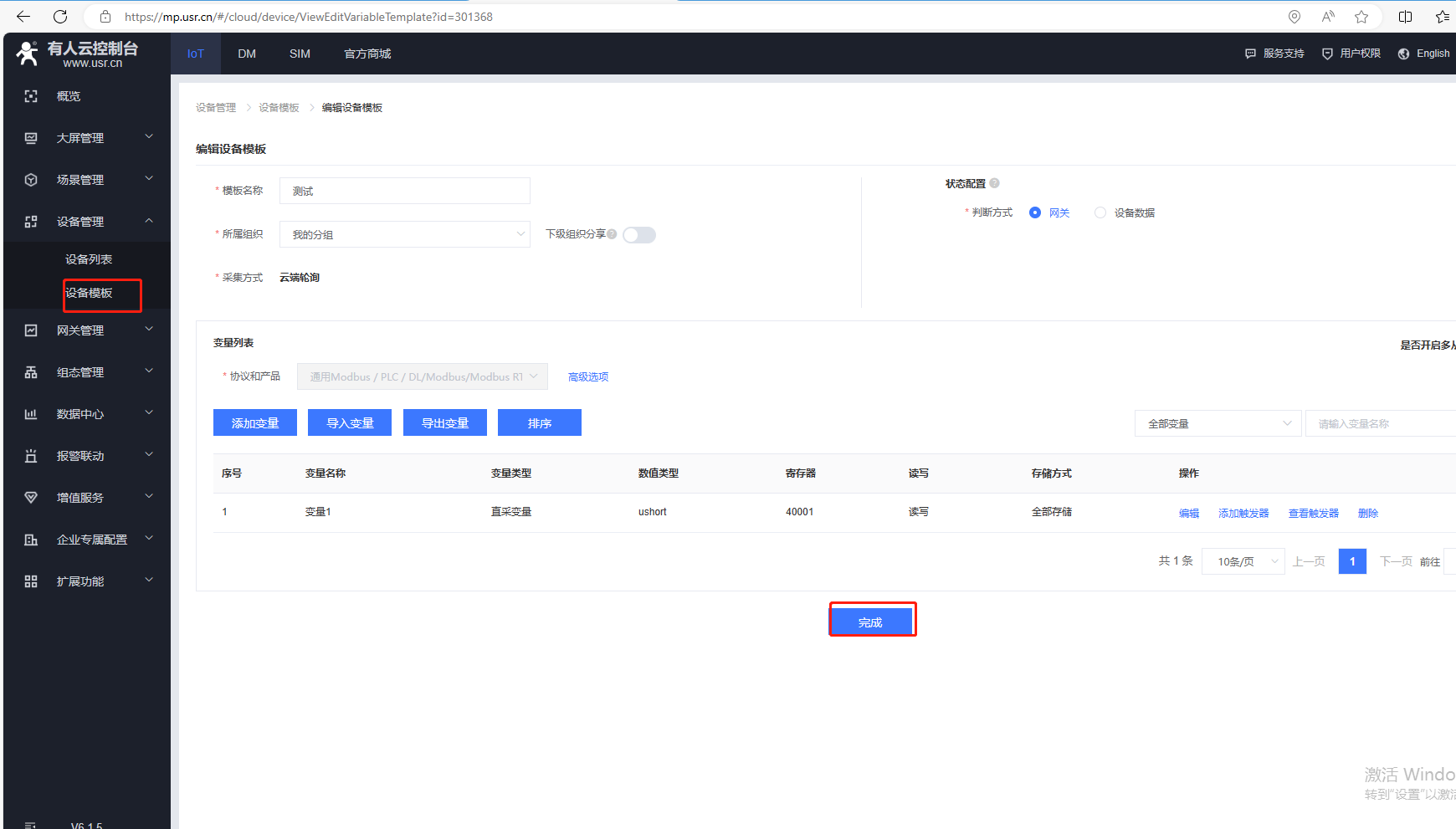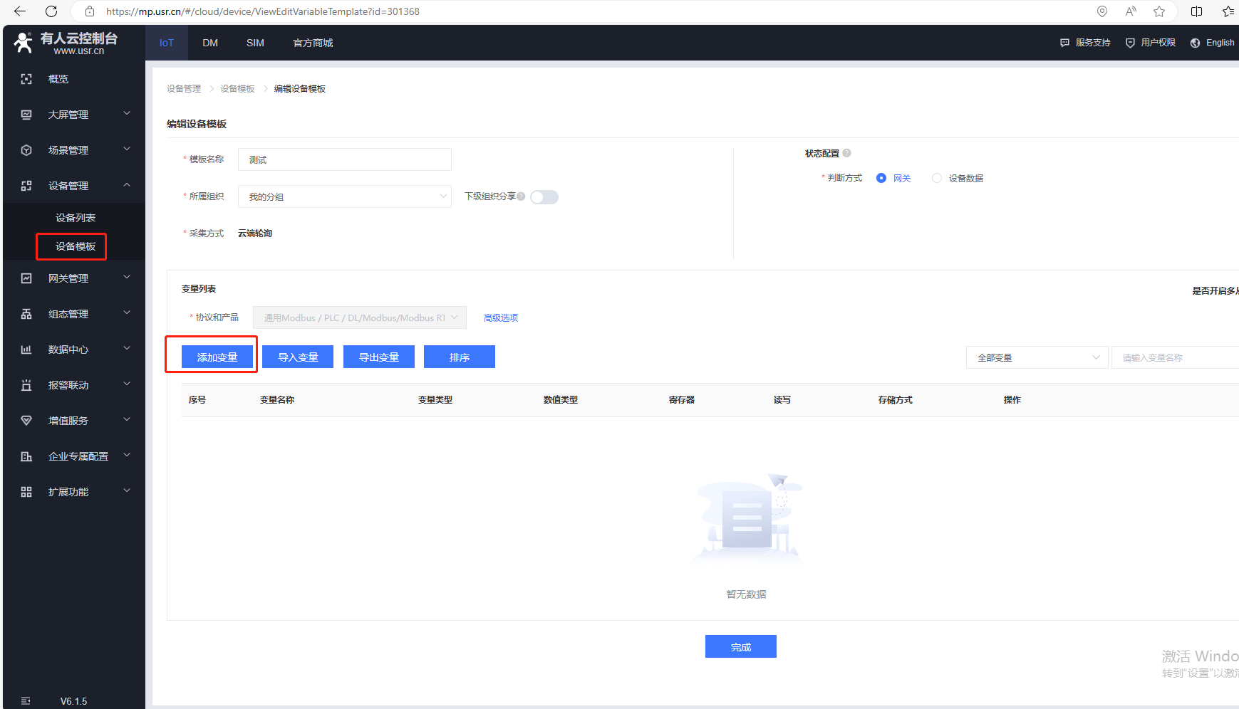 (7)添加變量,點擊設備管理,點擊設備模板,點擊編輯。