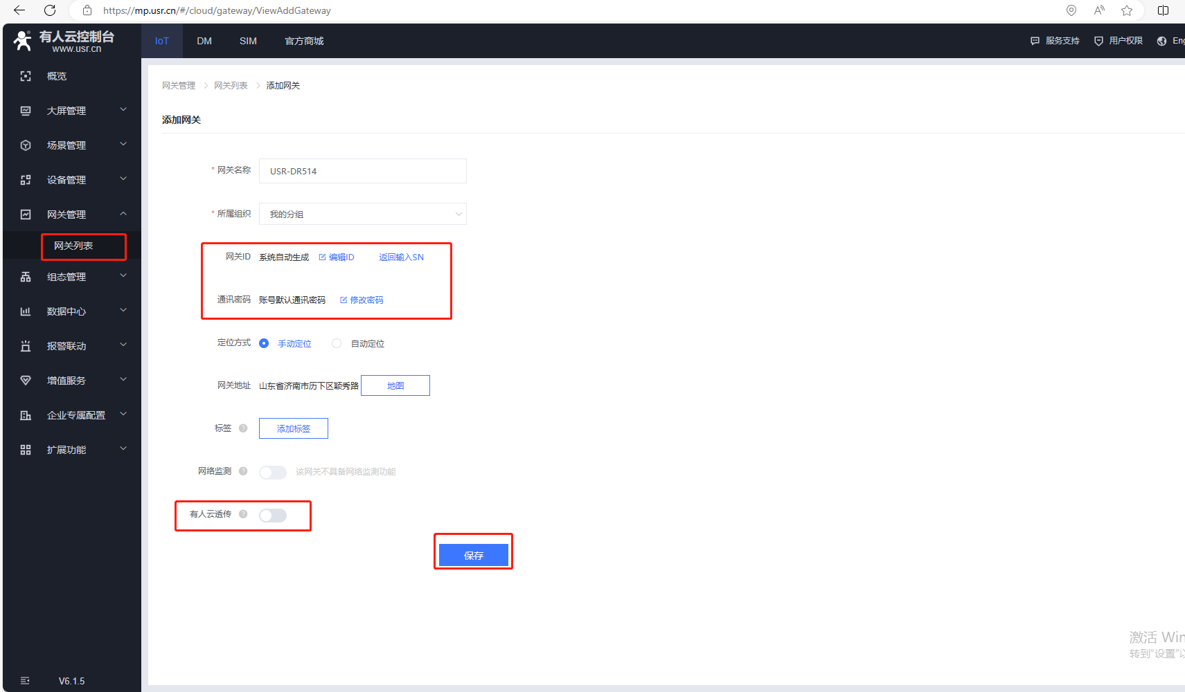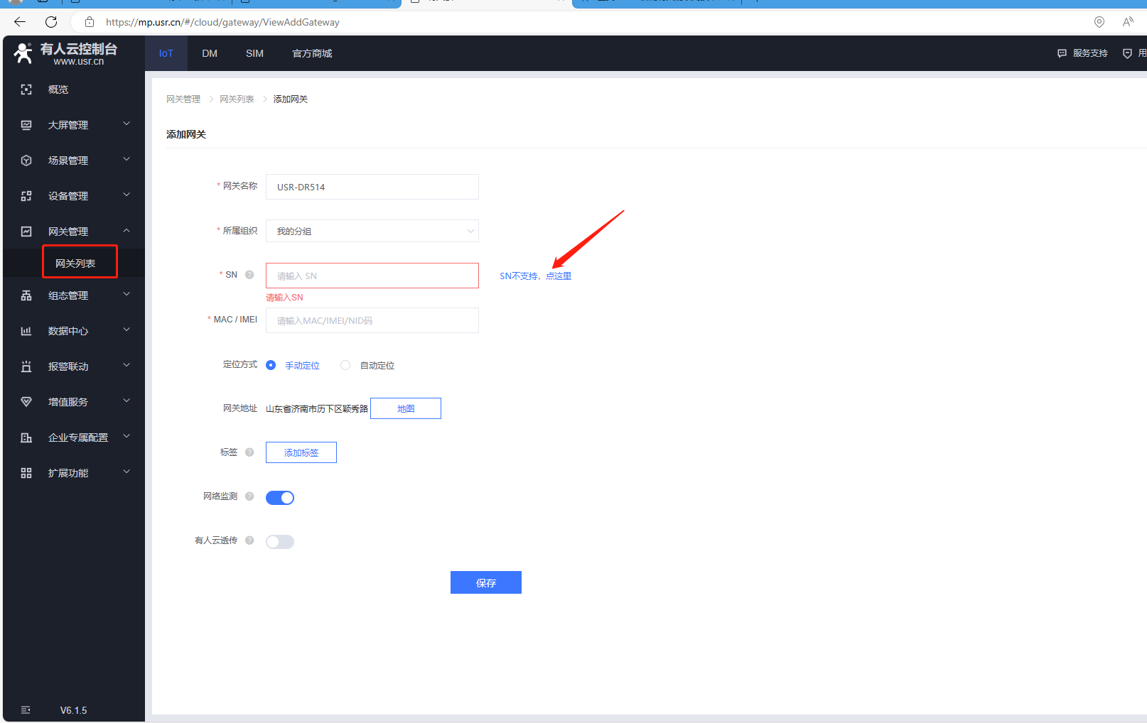 (2)USR-DR514不支持SN上云,就點擊SN不支持,點這里,用自動生成的ID方式上云,在有人云上添加設備,用云端輪詢時有人云透傳需要關閉,最后點擊保存。