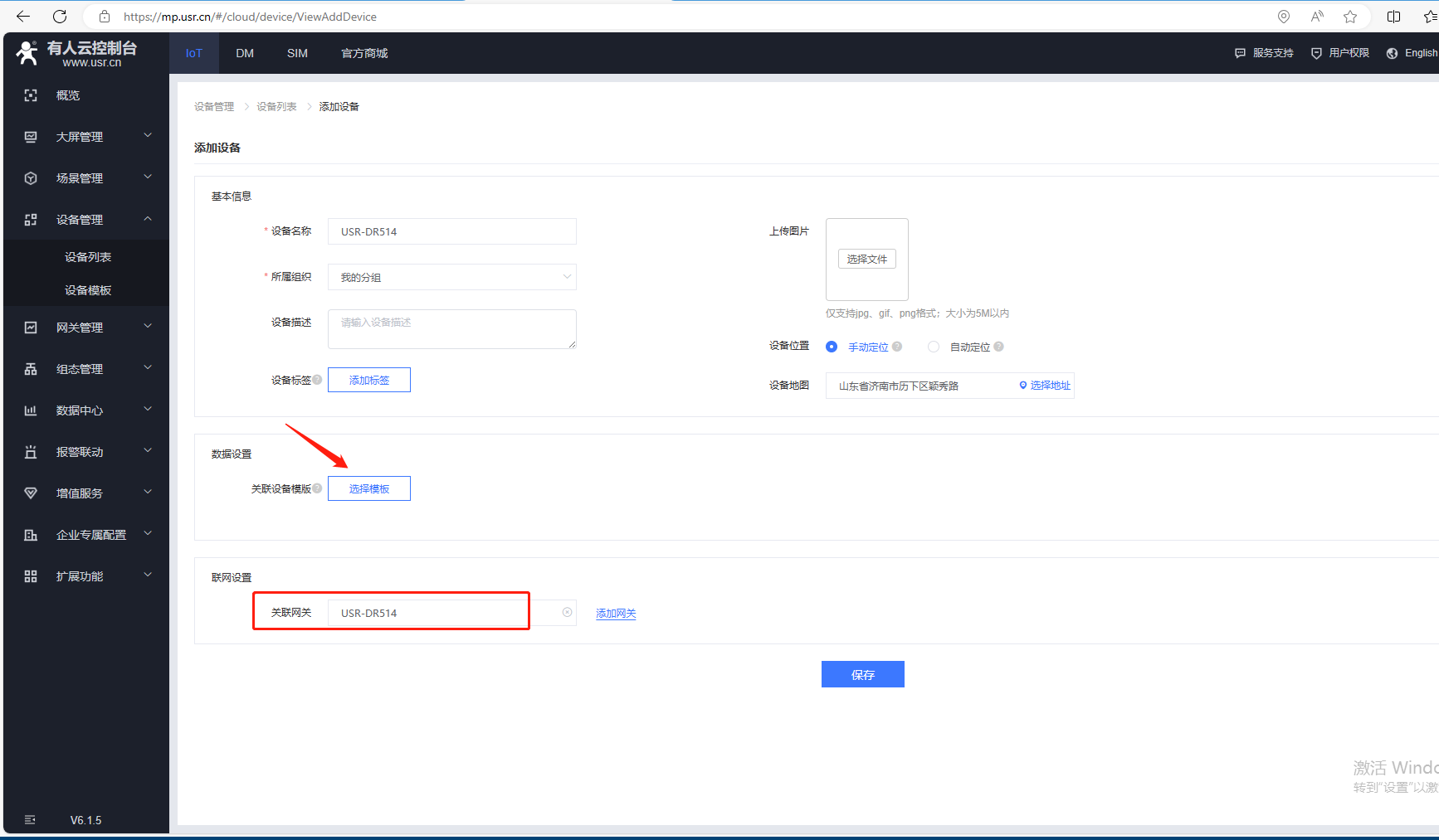 聯(lián)網(wǎng)設置,關聯(lián)網(wǎng)關選擇自身設備,USR-DR514,最后點擊保存。