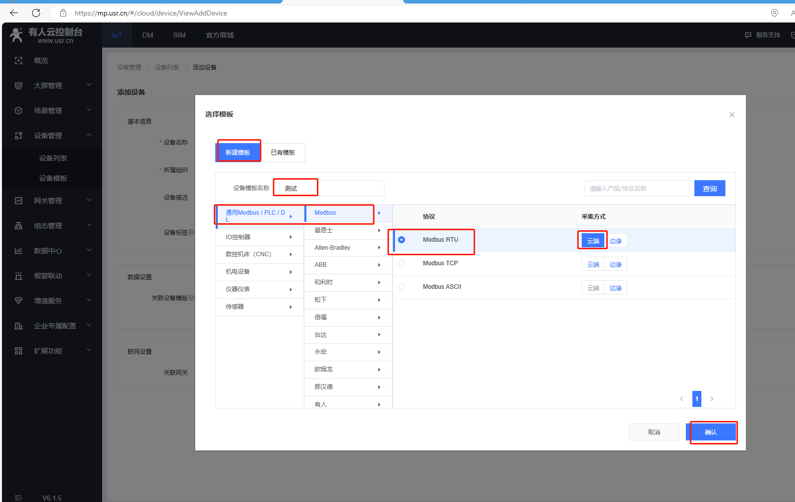選擇新建模板,輸入設備模板名稱,通用Modbus/PLC/DL,選擇Modbus,協(xié)議選擇Modbus Rtu,采集方式云端,最后確認。