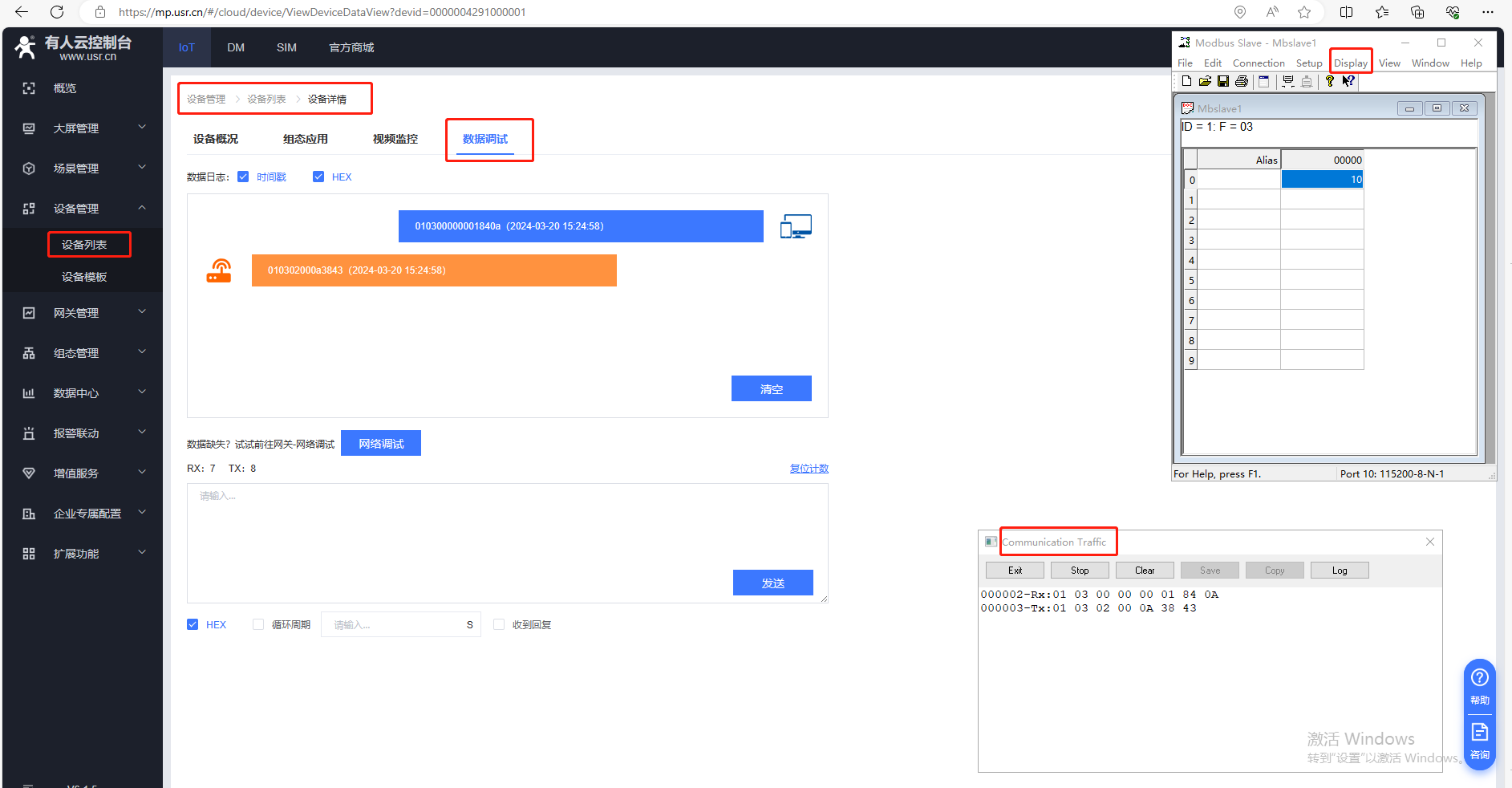 還可以利用有人云的數(shù)據(jù)調試功能,查看有人云的數(shù)據(jù)收發(fā)是否正常。