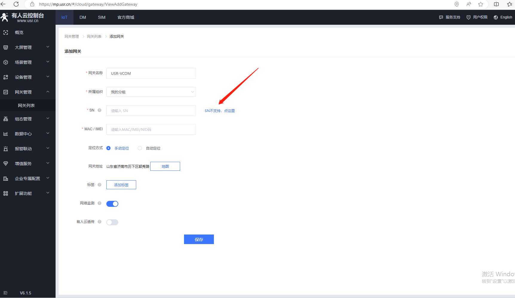 2、USR-VCOM虛擬串口添加,點(diǎn)擊SN不支持,點(diǎn)這里,用自動生成的ID方式上云,在有人云上添加設(shè)備,勾選有人云透傳。