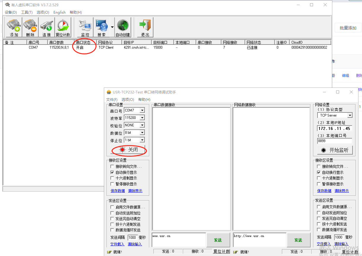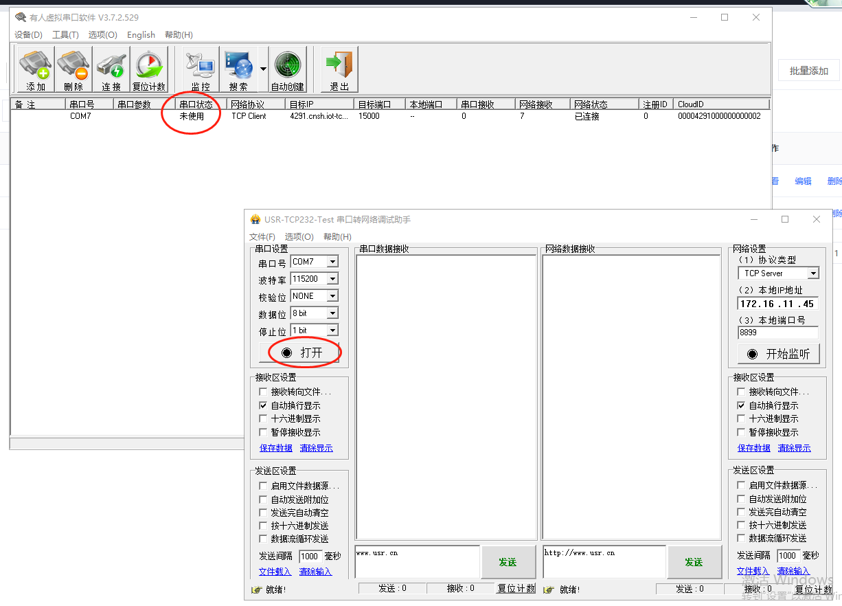 1、打開2個串口助手,分別用USR-DR514實(shí)際USB串口COM10打開串口,另一個串口助手用虛擬串口COM7打開串口。