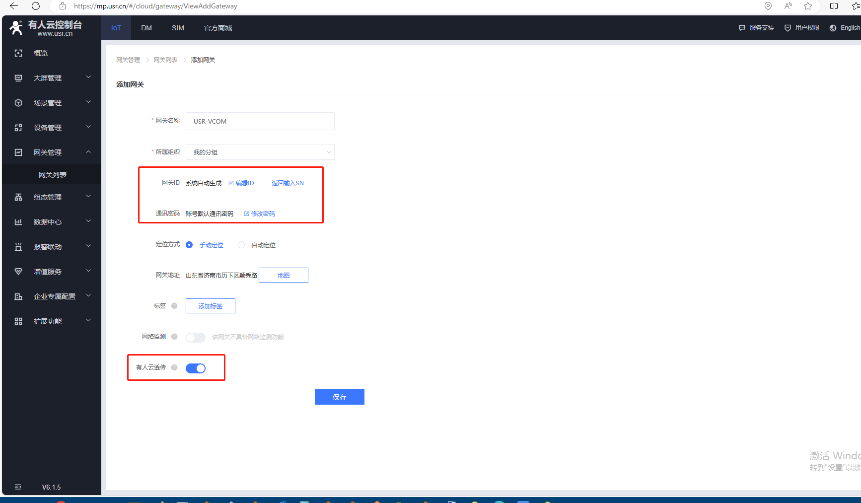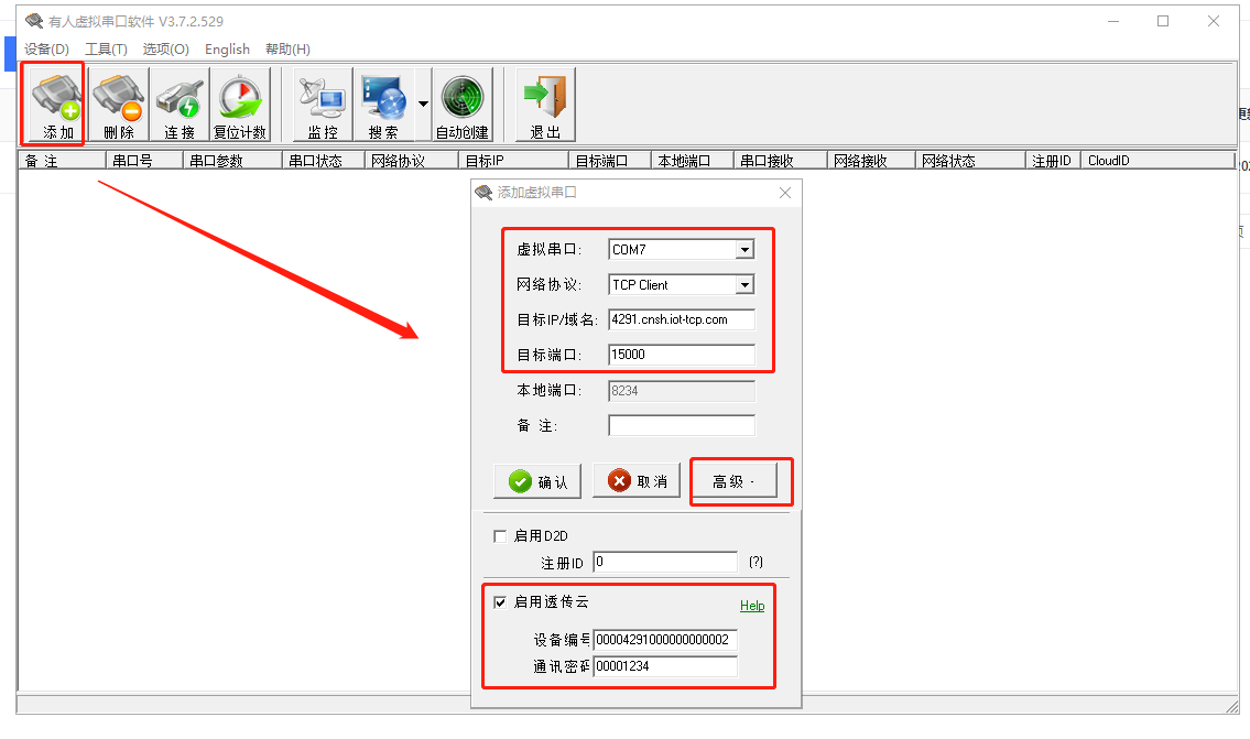 高級設(shè)置開啟透傳云,輸入有人云添加設(shè)備的編號ID00004291000000000002和密碼00001234,點(diǎn)擊確認(rèn)。