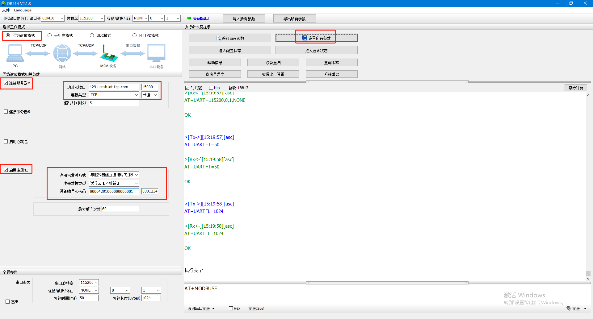 設(shè)置服務(wù)器地址4291.cnsh.iot-tcp.com和端口號15000,開啟注冊包,輸入有人云添加設(shè)備的ID00004291000000000001和密碼00001234,點(diǎn)擊設(shè)置所有參數(shù)。