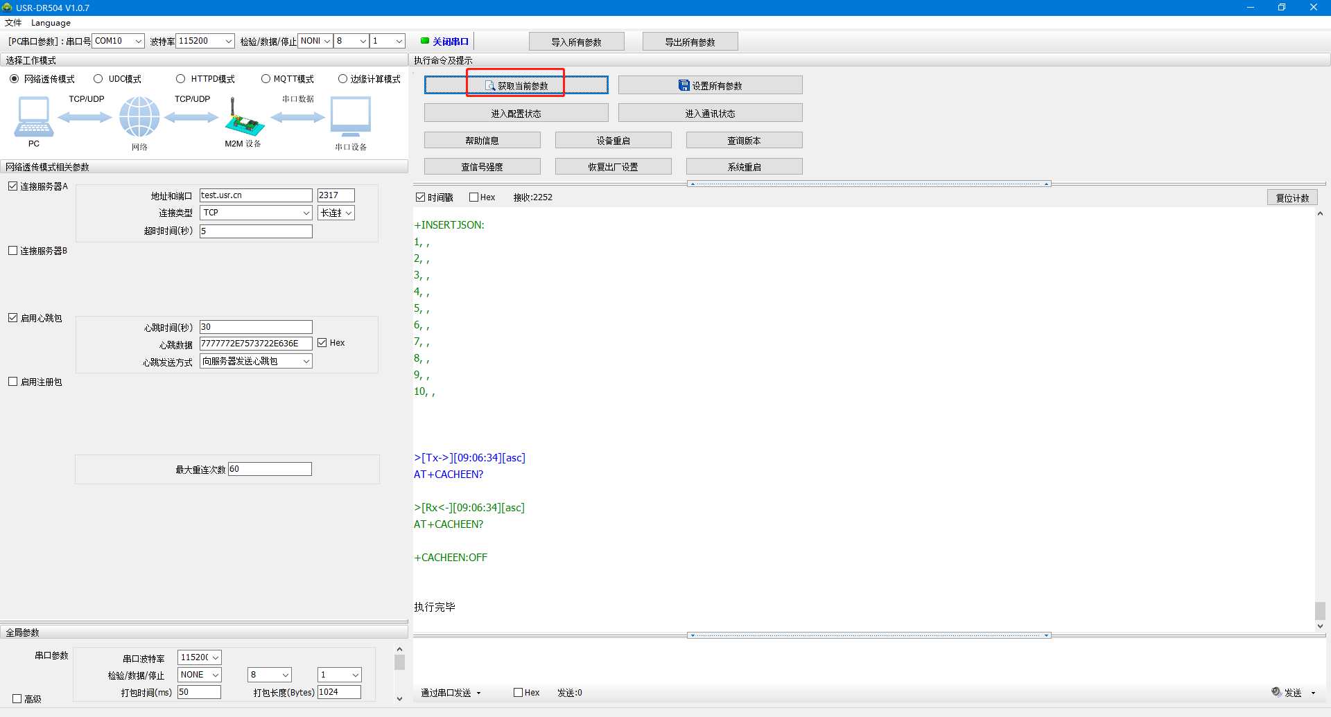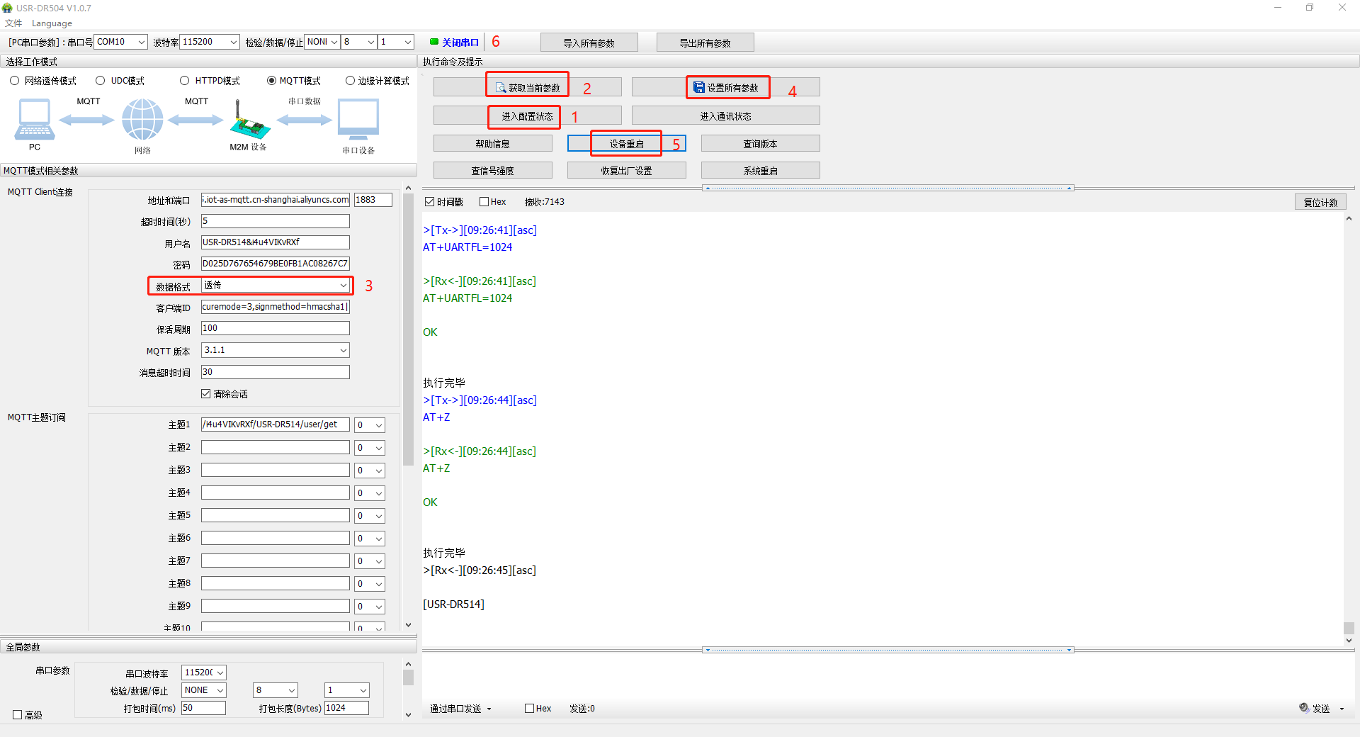 (1)USR-DR514,點(diǎn)擊進(jìn)入配置狀態(tài),點(diǎn)擊獲取當(dāng)前參數(shù),數(shù)據(jù)格式設(shè)置透傳,點(diǎn)擊設(shè)置所有參數(shù),點(diǎn)擊設(shè)備重啟,最后關(guān)閉串口。
