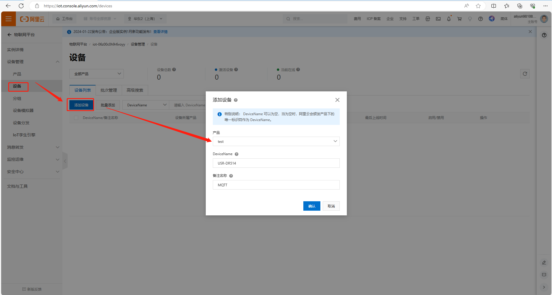 (1)產(chǎn)品創(chuàng)建成功后,添加設(shè)備。點(diǎn)擊設(shè)備,點(diǎn)擊添加設(shè)備,產(chǎn)品名舉例填test,DeviceName填USR-DR514,備注名稱填MQTT,點(diǎn)擊確認(rèn)。
