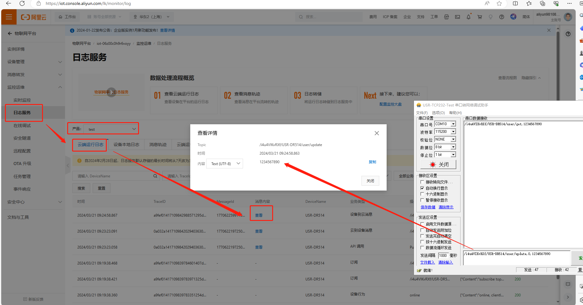 (3)USR-DR514使用串口助手發(fā)送數(shù)據(jù)/i4u4VIKvRXf/USR-DR514/user/update,0,1234567890,發(fā)送完成之后,我們在阿里云平臺可以通過日志服務(wù),點(diǎn)擊查看,看到USR-DR514串口發(fā)到阿里云的數(shù)據(jù)1234567890。