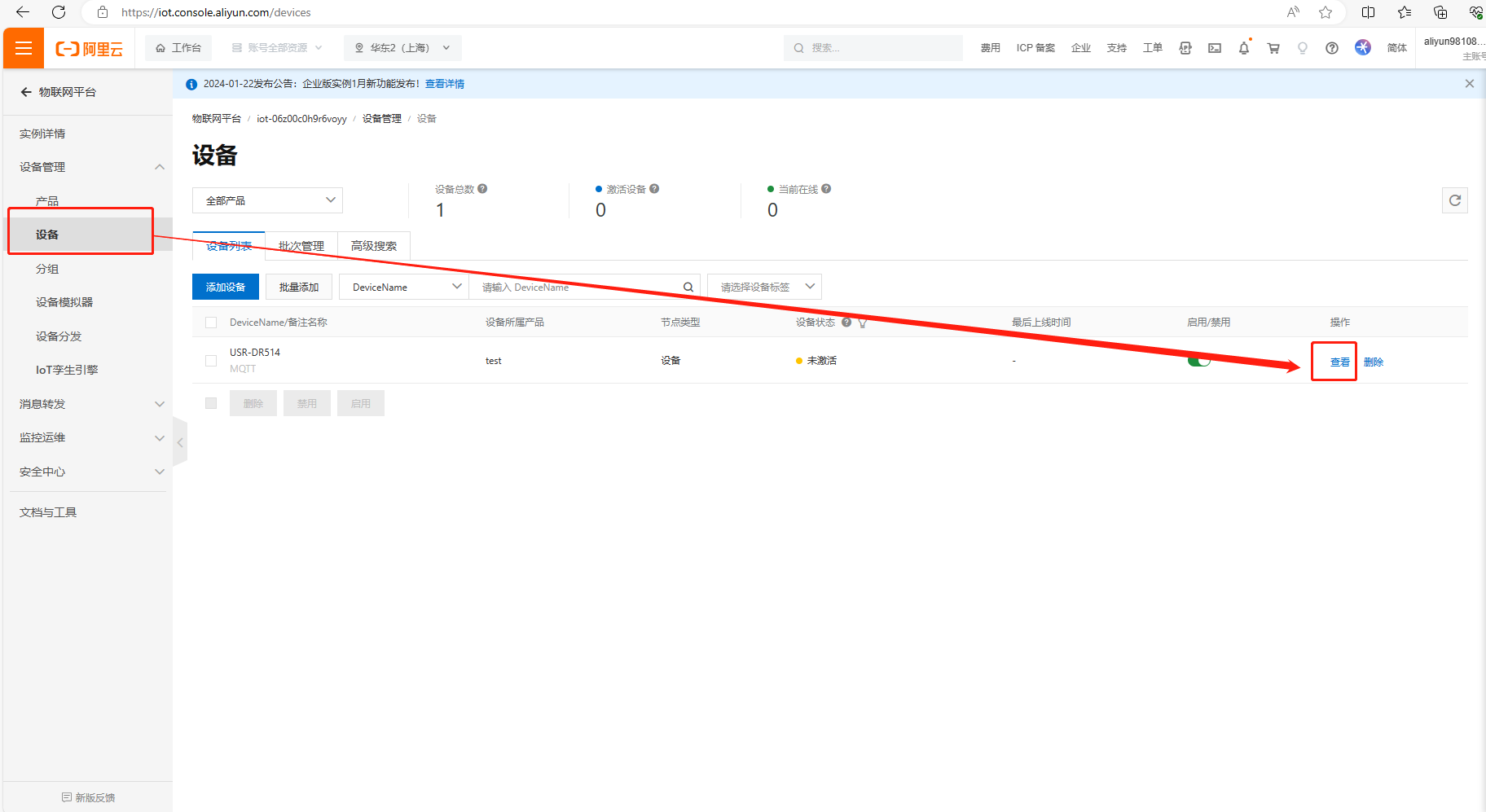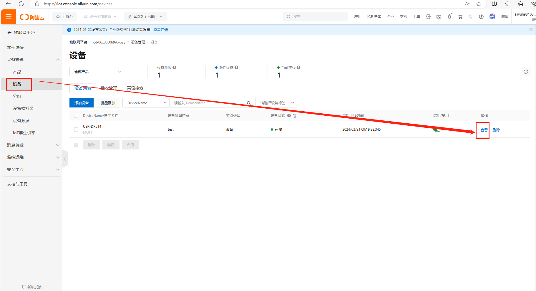 (2)登陸阿里云平臺,點(diǎn)擊設(shè)備,點(diǎn)擊查看