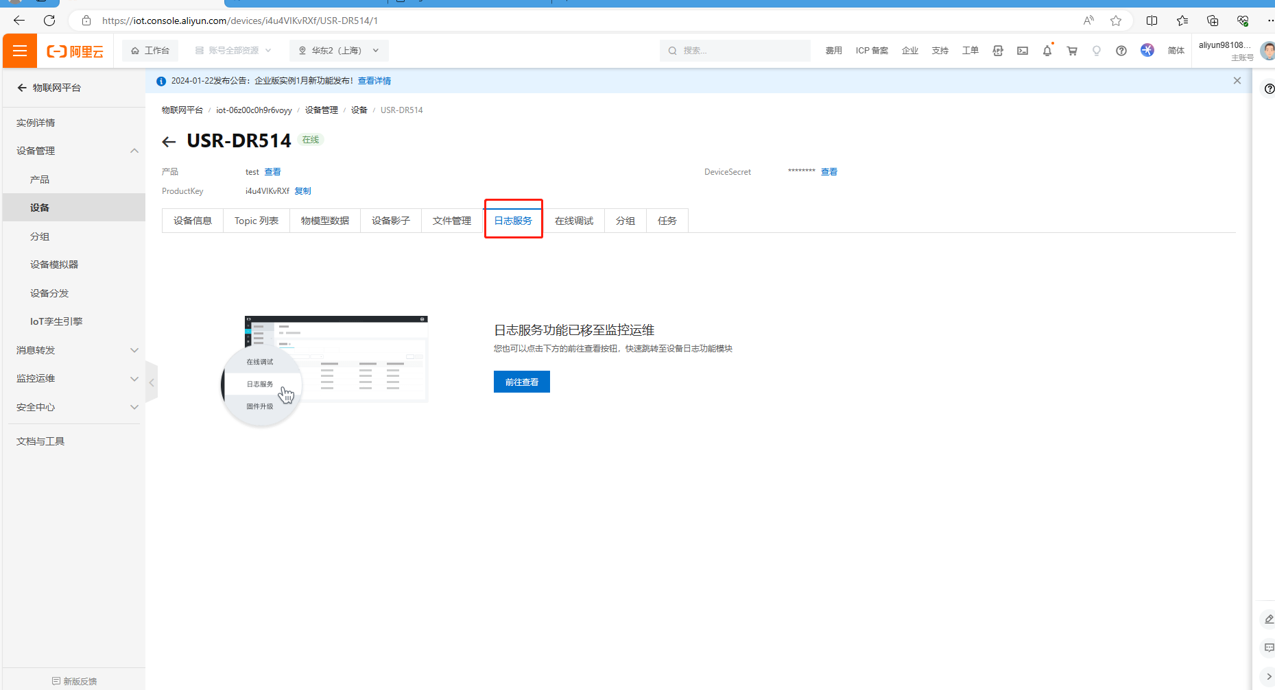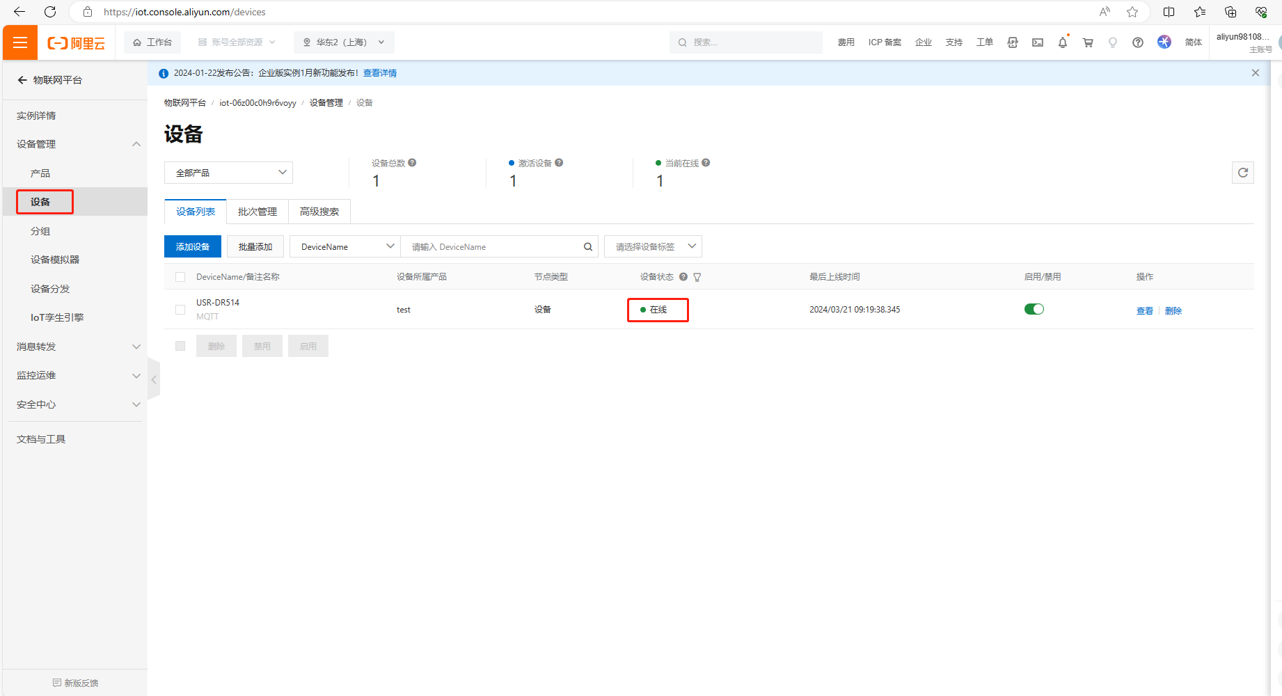 USR-DR514 設(shè)置完MQTT連接阿里云參數(shù),聯(lián)網(wǎng)正常,在阿里云平臺可以看到設(shè)備狀態(tài)是在線。