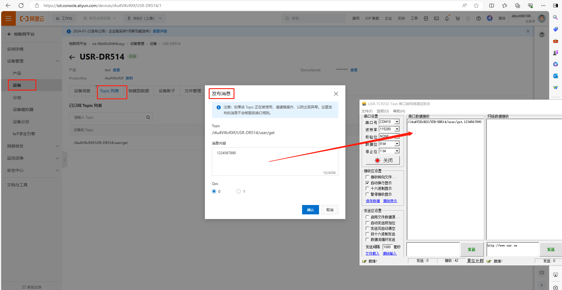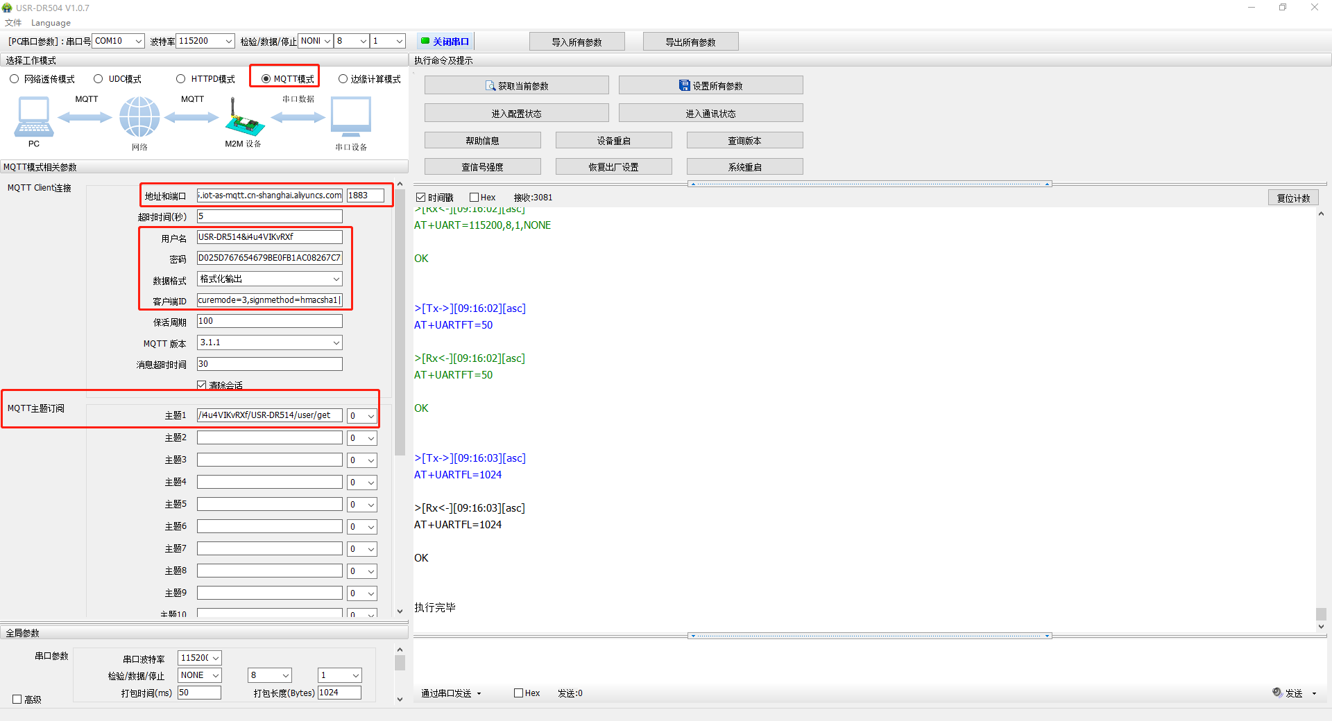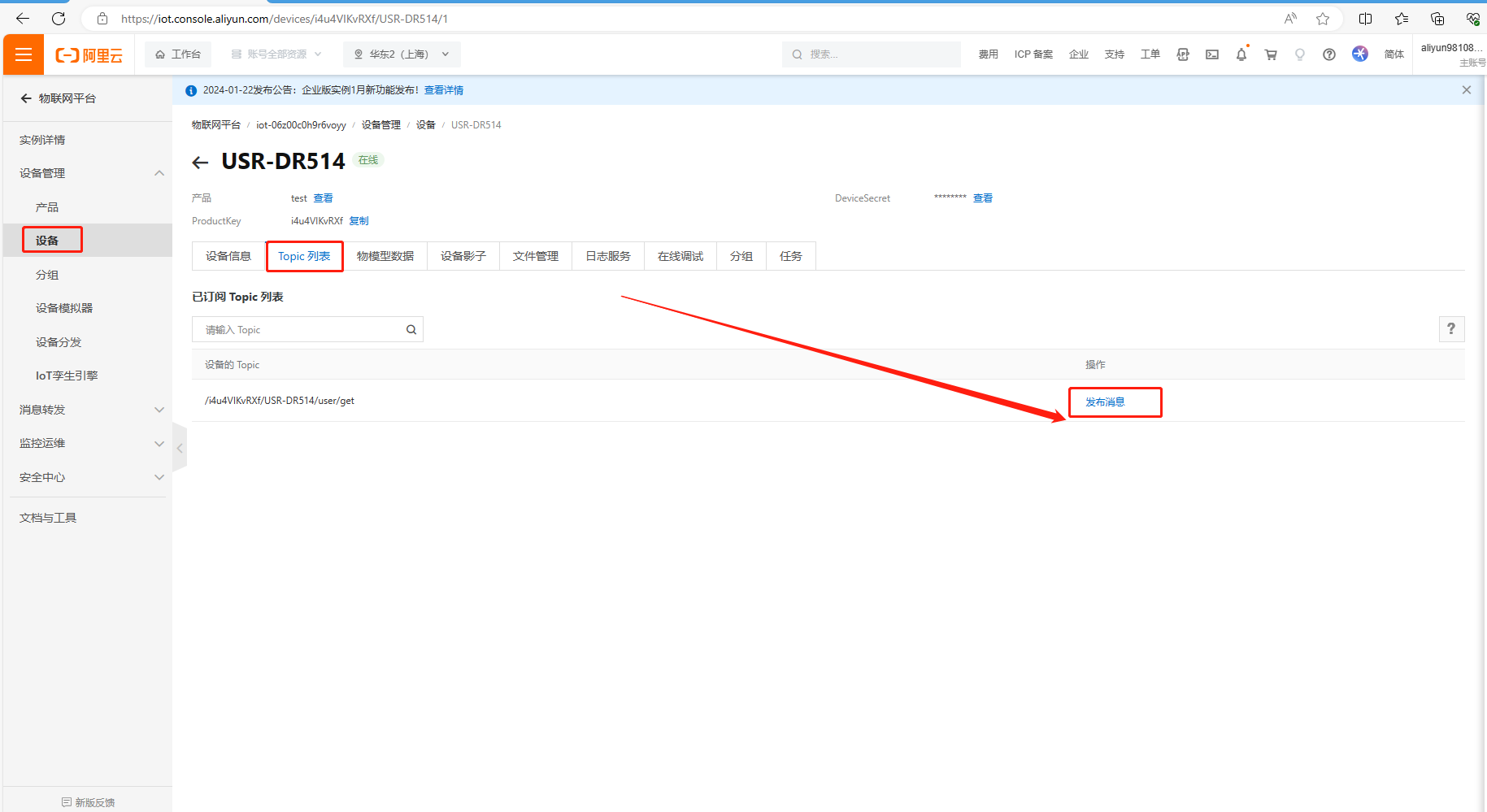 USR-DR514連接阿里云的用戶名:USR-DR514&i4u4VIKvRXf