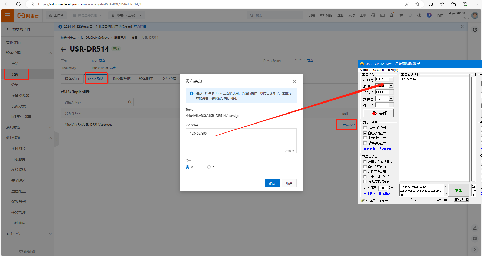 (4)使用阿里云平臺發(fā)布的消息www.xyglz.cn,被USR-DR514訂閱到,并通過USR-DR514串口發(fā)給串口端,數(shù)據(jù)格式是透傳,串口助手接收的數(shù)據(jù)www.xyglz.cn