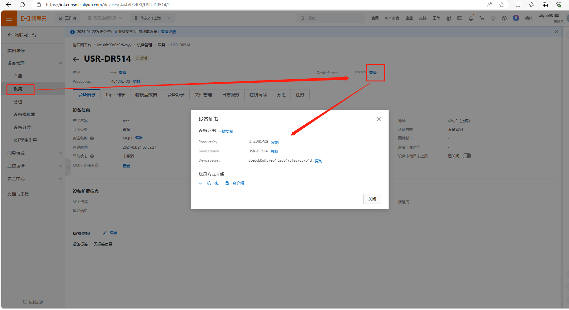 5、查看設(shè)備證書內(nèi)容,生成USR-DR514連接阿里云的用戶名