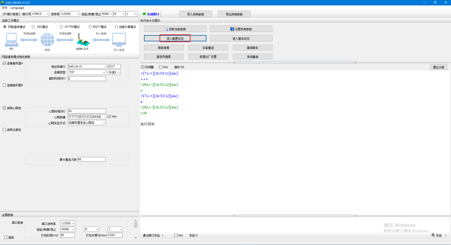 2、打開串口,點(diǎn)擊進(jìn)入配置狀態(tài)