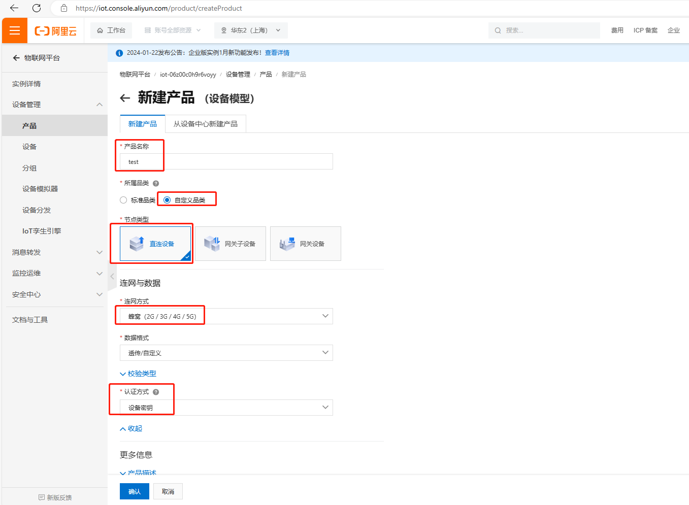 產(chǎn)品名稱舉例test——所屬品類選擇自定義品類——節(jié)點(diǎn)類型選擇直連設(shè)備——聯(lián)網(wǎng)與數(shù)據(jù)聯(lián)網(wǎng)方式選擇蜂窩(2G/3G/4G/5G)——數(shù)據(jù)格式選擇透傳/自定義——認(rèn)證方式選擇設(shè)備秘鑰——點(diǎn)擊確定,完成創(chuàng)建產(chǎn)品。