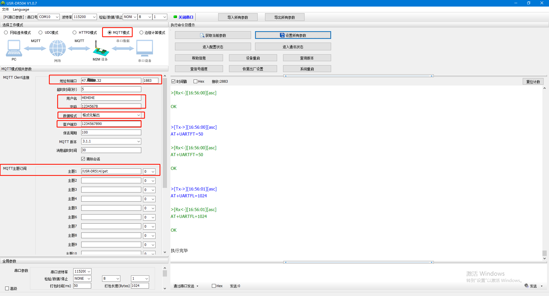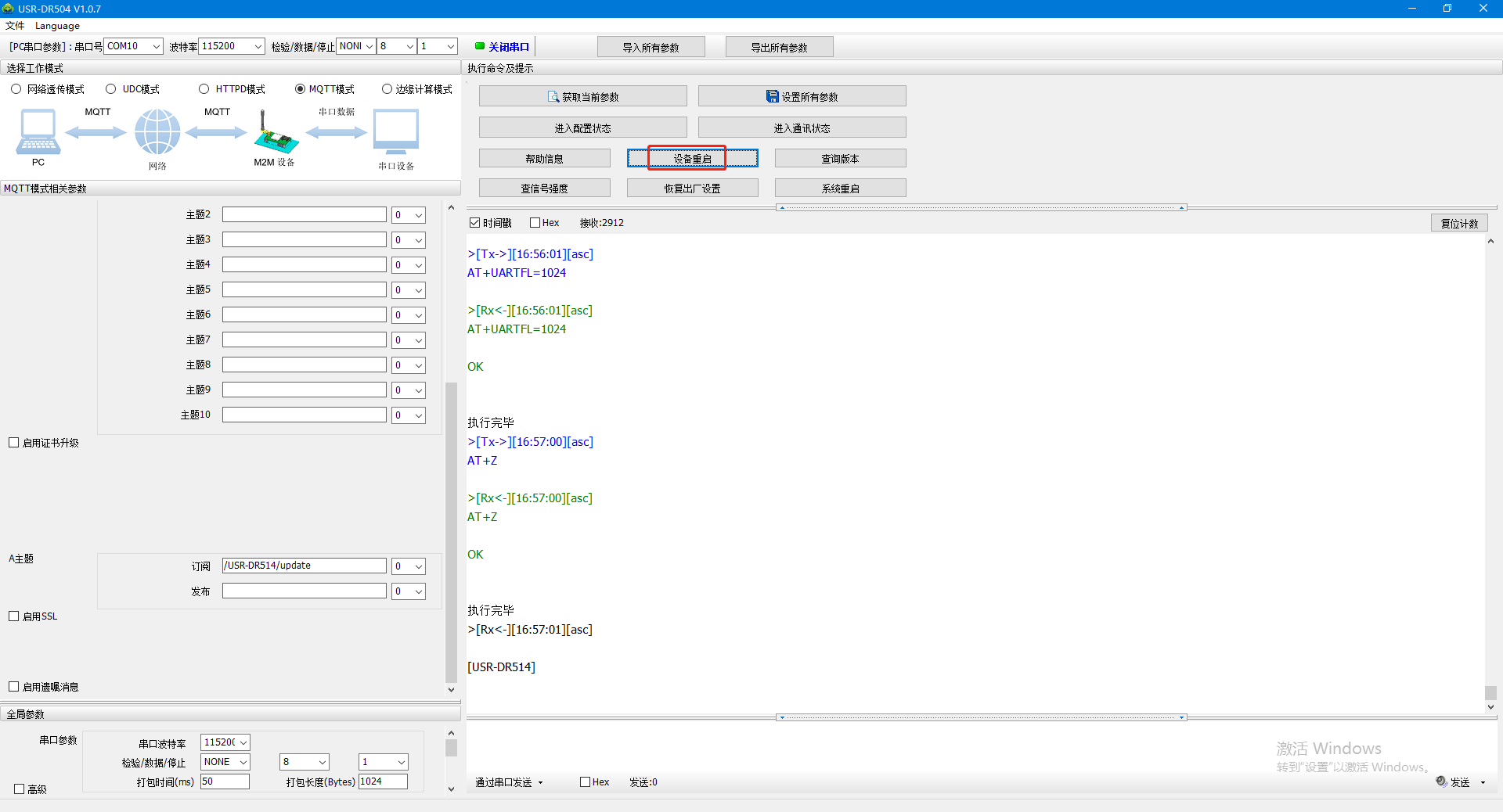 (8)A主題:發(fā)布主題,填寫/USR-DR514/update,設置軟件點擊設置所有參數(shù),