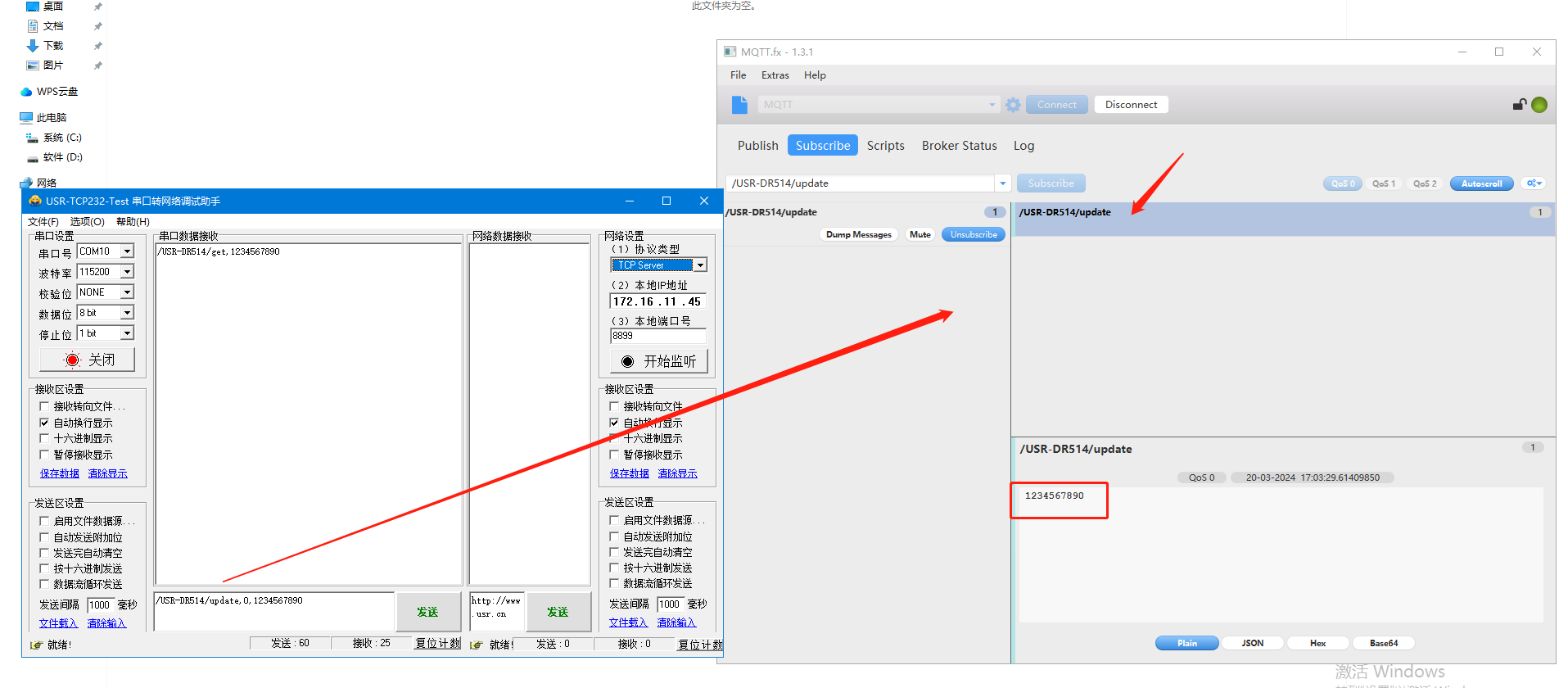 串口助手發(fā)送框輸入/USR-DR514/update,0,1234567890,發(fā)送給MQTT.fx軟件,點擊MQTT.fx軟件的每一條/USR-DR514/update可以看到接收的數(shù)據(jù)1234567890