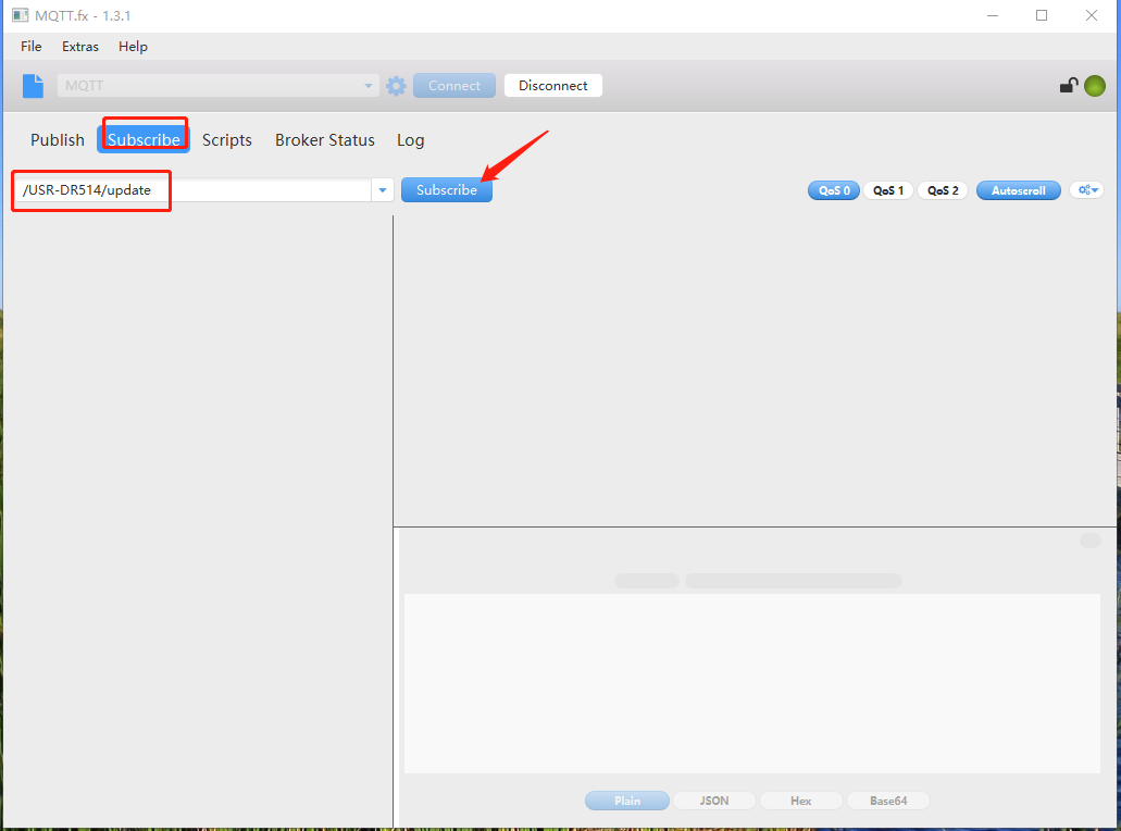 (2)MQTT.fx軟件點擊Subscribe,輸入/USR-DR514/update,點擊后面的Subscribe。