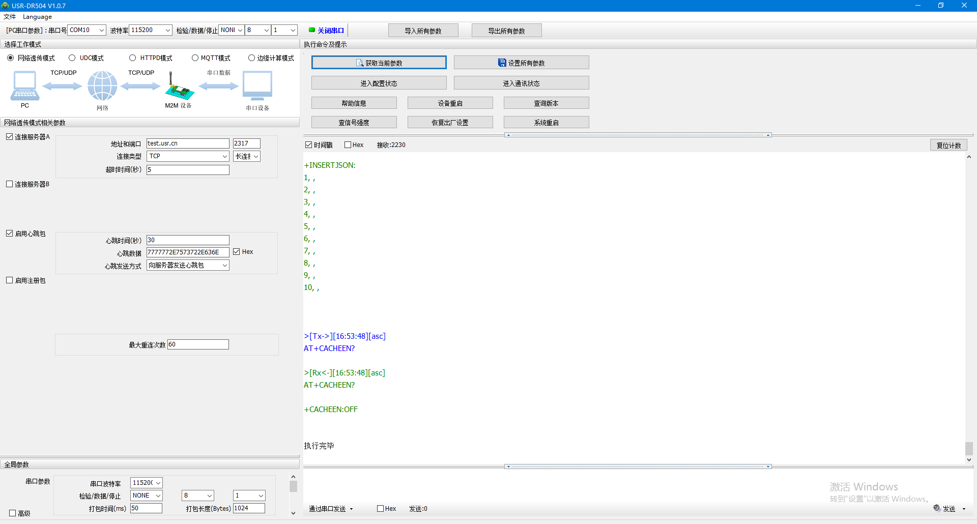 (1)USR-DR514打開設置軟件,選擇COM10,點擊進入配置狀態(tài),點擊獲取當前參數(shù),數(shù)據(jù)格式設置透傳,點擊設置所有參數(shù),點擊設備重啟,最后點擊關(guān)閉串口。