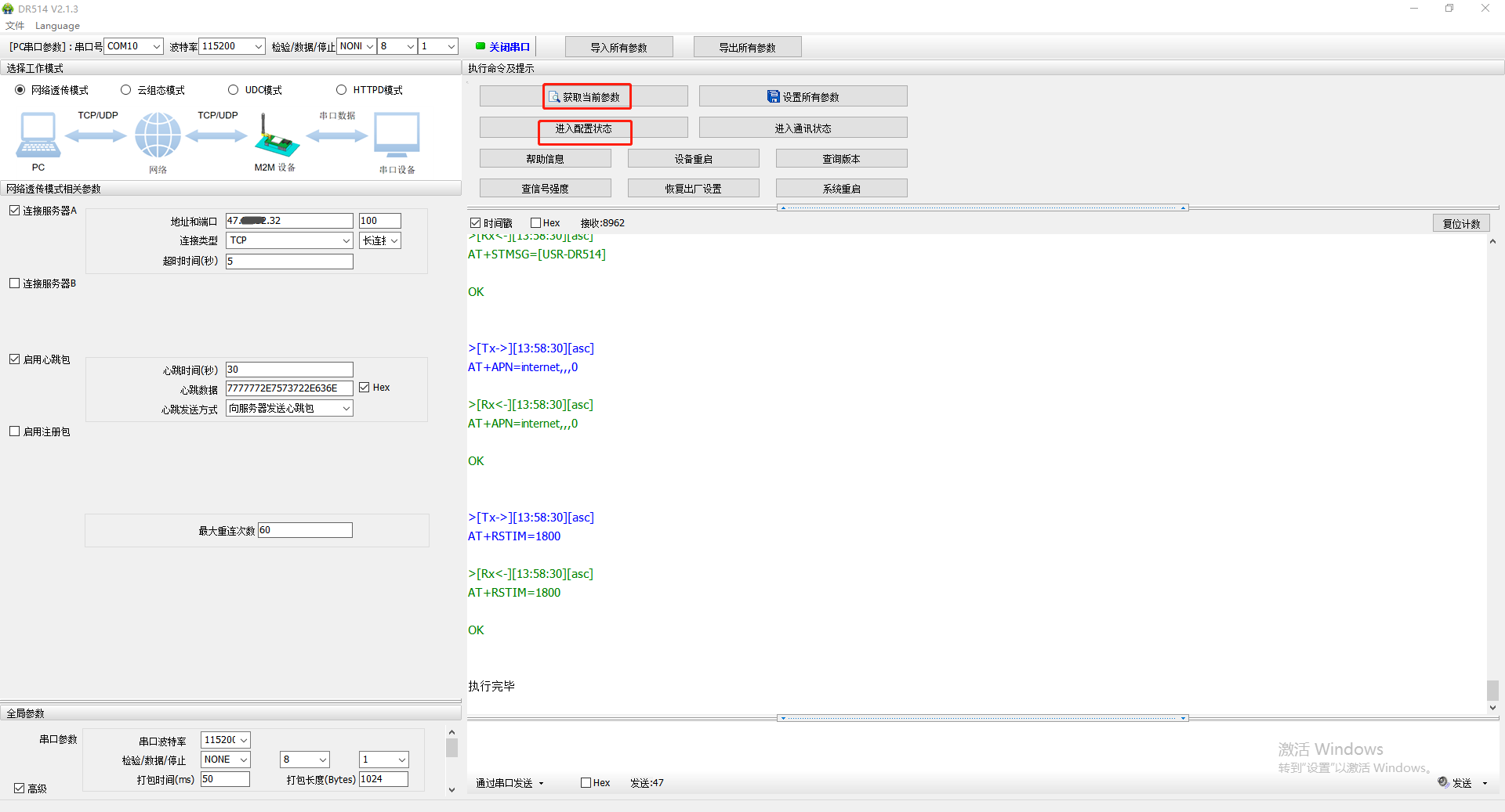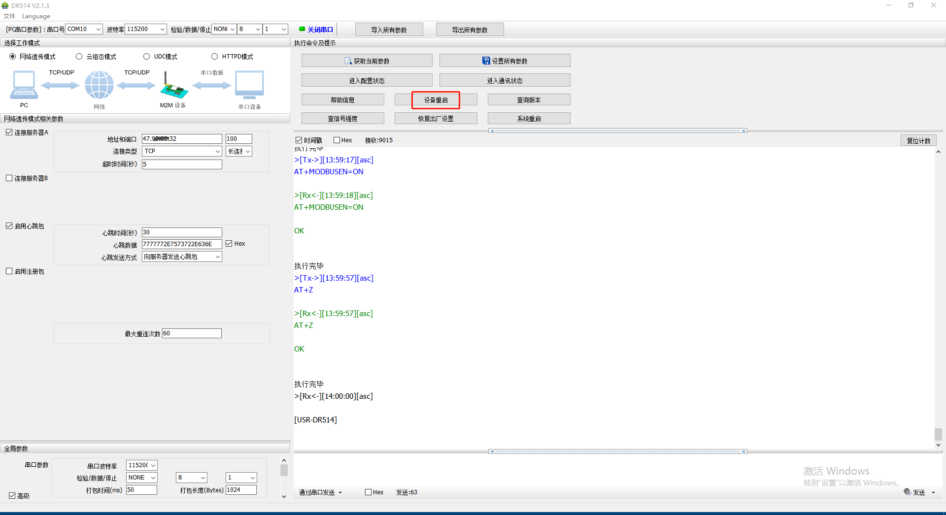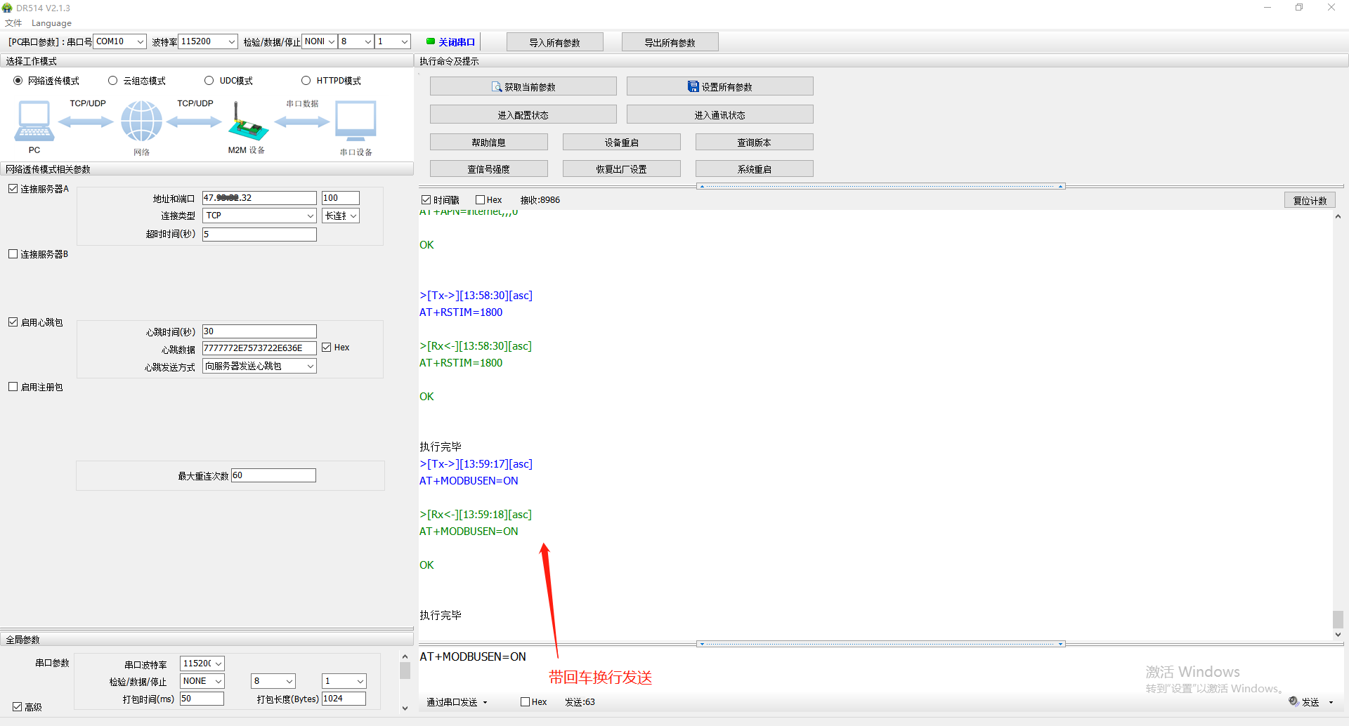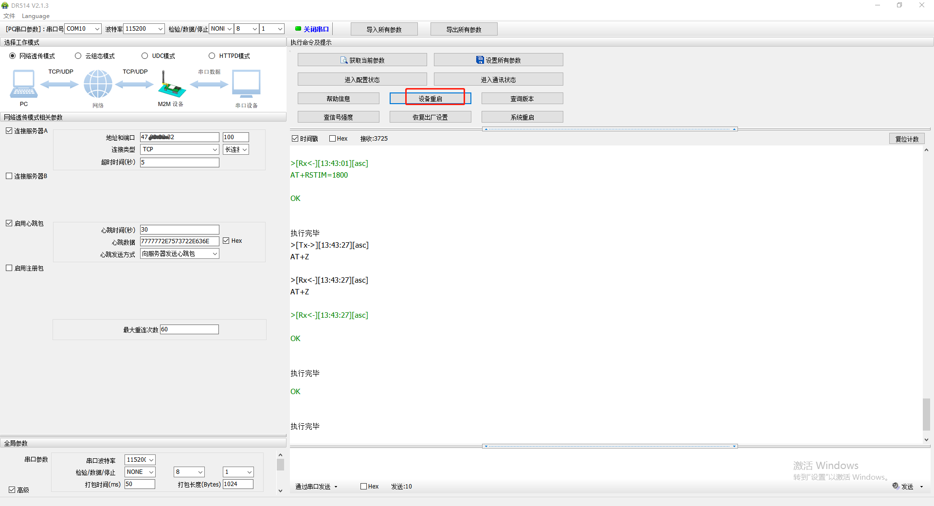 4、選擇網(wǎng)絡(luò)透傳模式,連接服務(wù)器A,地址輸入要連接的遠程服務(wù)器地址,端口用100,點擊設(shè)置所有參數(shù),發(fā)送區(qū)輸入一條開啟 Modbus 協(xié)議轉(zhuǎn)換功能的AT指令A(yù)T+MODBUSEN=ON,點擊發(fā)送。發(fā)送完,點擊設(shè)備重啟。