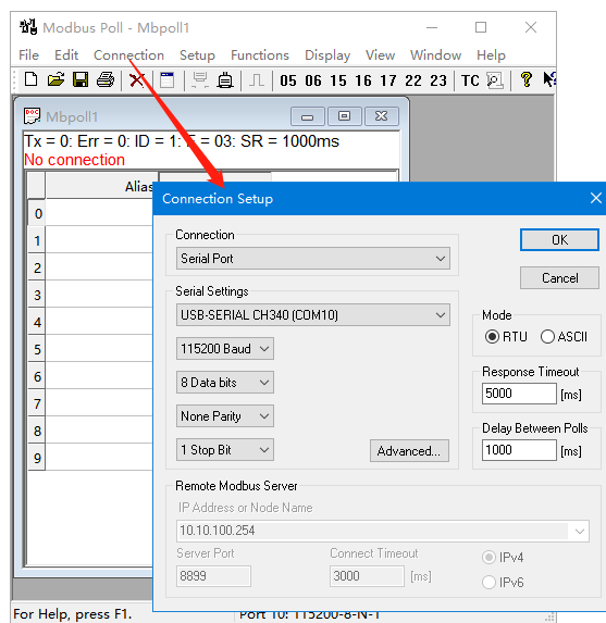 4、Modbus Poll軟件,點擊Connection,選擇Serial Port,選擇對應(yīng)的COM口COM10,對應(yīng)USR-DR514的串口參數(shù),最后點擊OK。