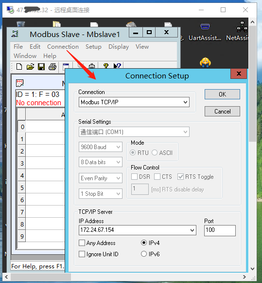 2、Modbus Slave軟件,點擊Connection,選擇Modbus TCP/IP,TCP/IP Server IP Address填遠程服務(wù)器對應(yīng)的服務(wù)器地址IP,Port端口100。最后點擊OK。
